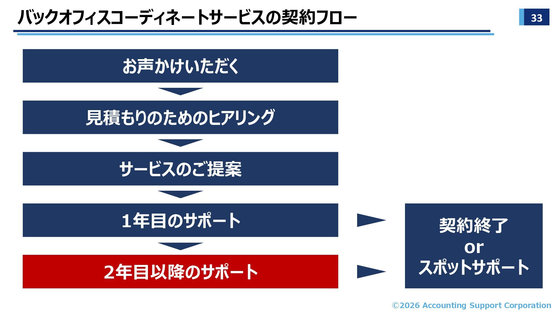 33 Ⓒ2026 Accounting Support Corporation バックオフィスコーディネートサービスの契約フロー お声かけいただく 見積もりのためのヒアリング サービスのご提案 1年目のサポート