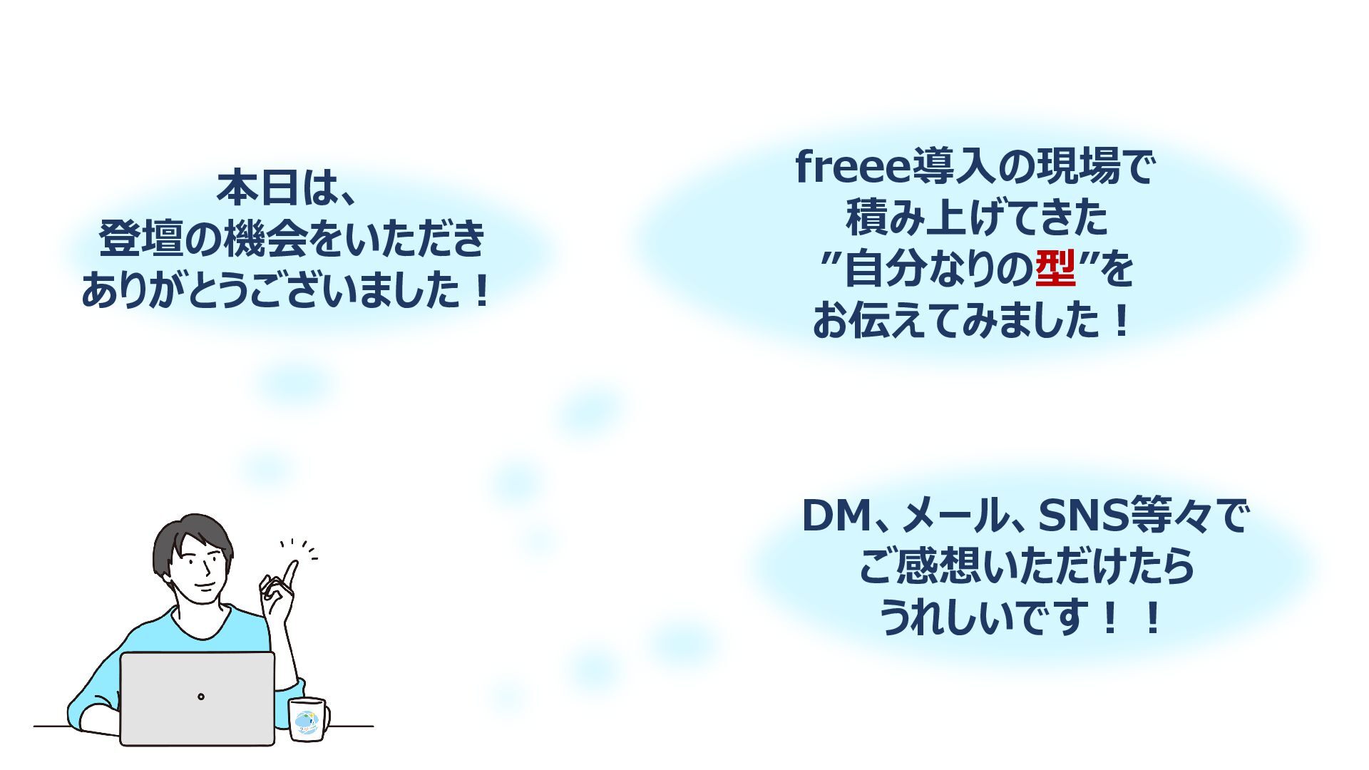 本日は、 登壇の機会をいただき ありがとうございました! freee導入の現場で 積み上げてきた ”自分なりの型”を お伝えてみました! DM、メール、SNS等々で ご感想いただけたら うれしいです!!