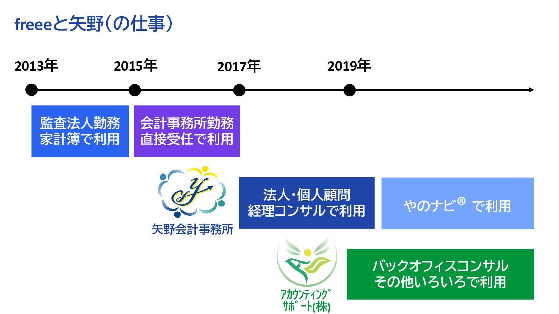 freeeと矢野(の仕事) 2013年 2015年 2017年 2019年 監査法人勤務 家計簿で利用 会計事務所勤務 直接受任で利用 法人・個人顧問