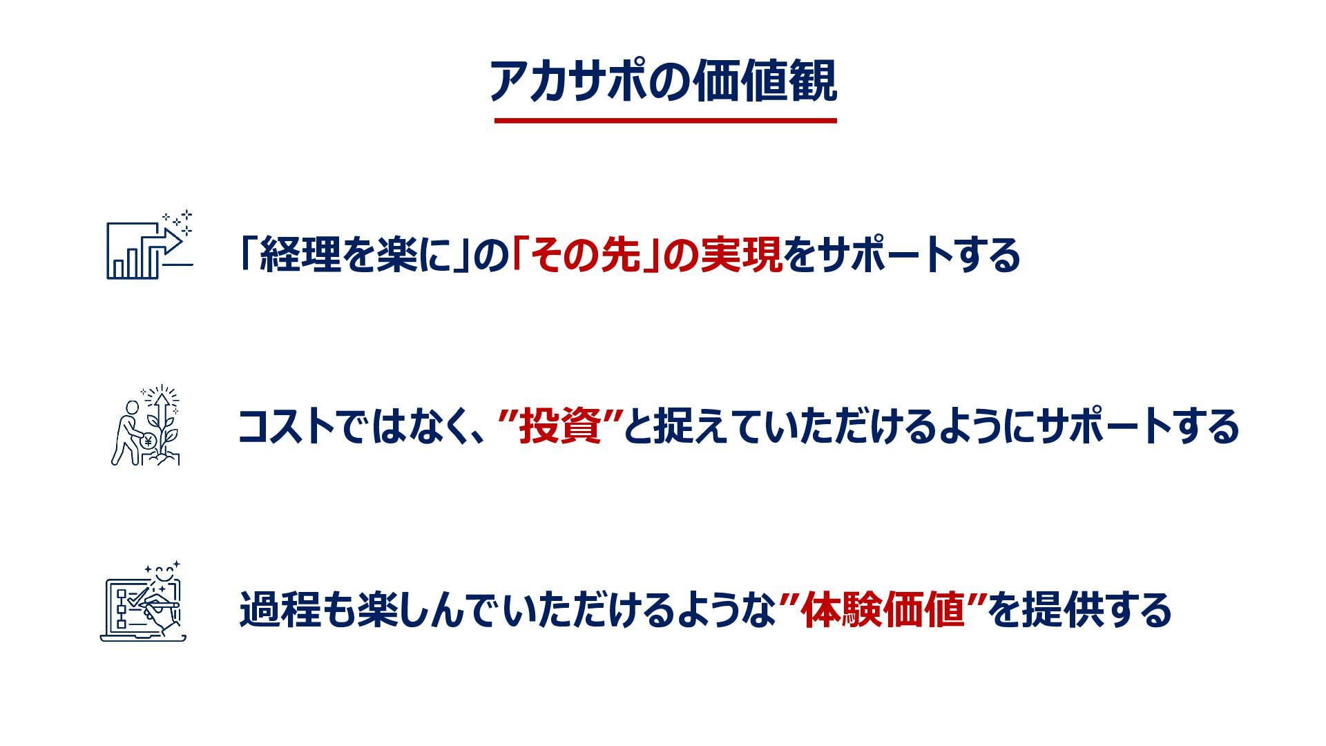 アカサポの価値観 「経理を楽に」の「その先」の実現をサポートする コストではなく、”投資”と捉えていただけるようにサポートする 過程も楽しんでいただけるような”体験価値”を提供する