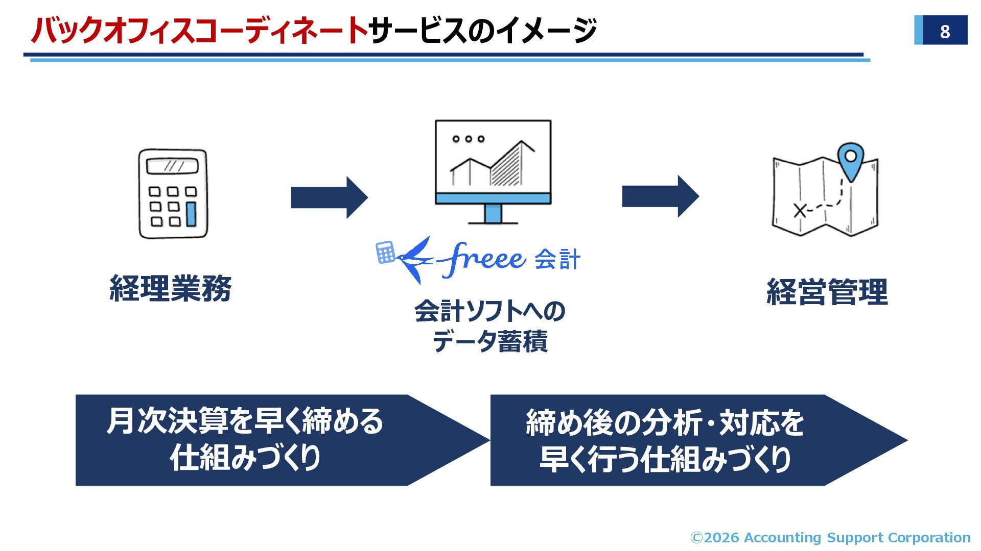 8 Ⓒ2026 Accounting Support Corporation バックオフィスコーディネートサービスのイメージ 月次決算を早く締める 仕組みづくり 締め後の分析・対応を 早く行う仕組みづくり