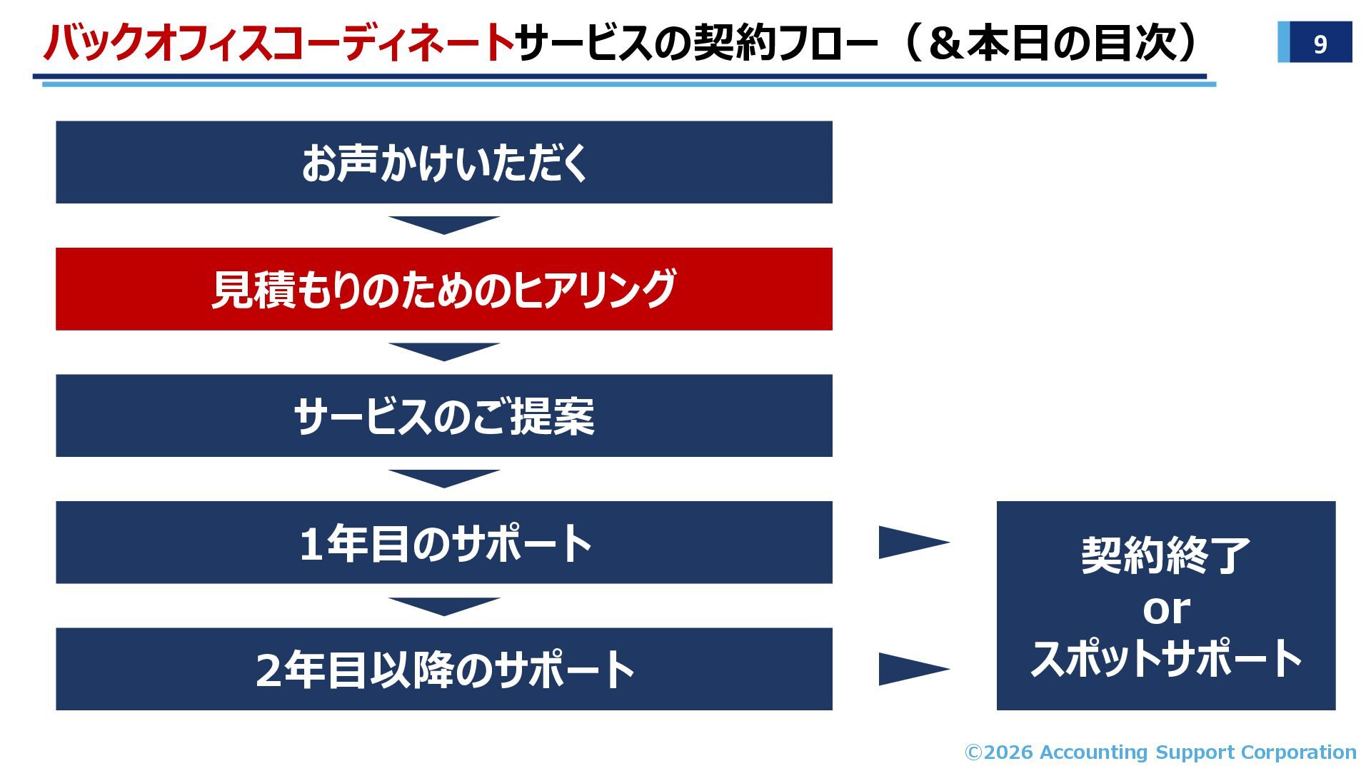 9 Ⓒ2026 Accounting Support Corporation バックオフィスコーディネートサービスの契約フロー(&本日の目次) お声かけいただく 見積もりのためのヒアリング サービスのご提案 1年目のサポート