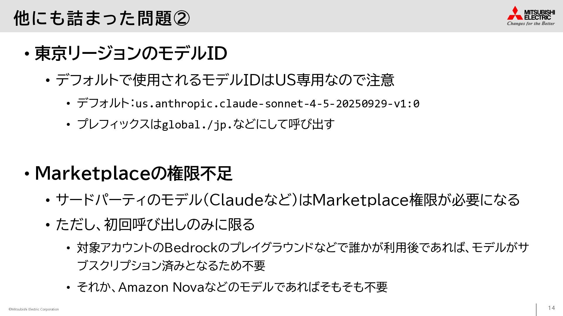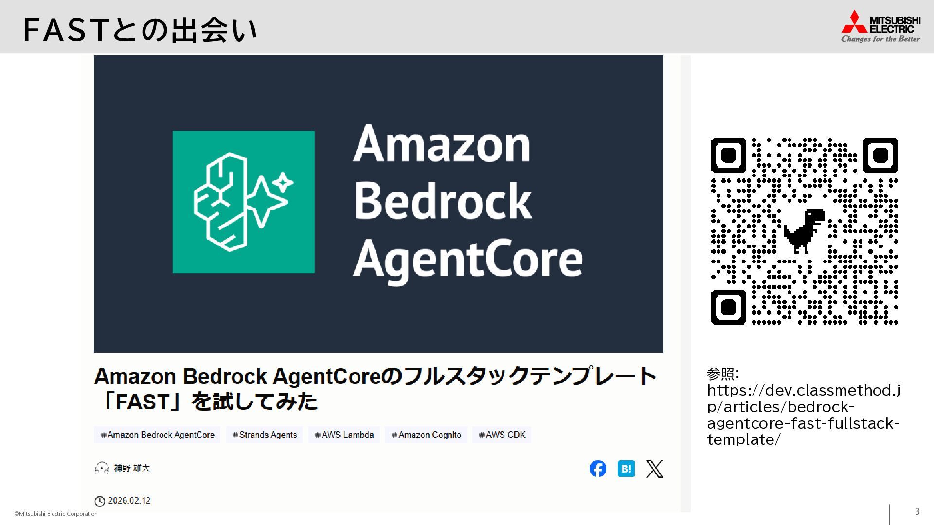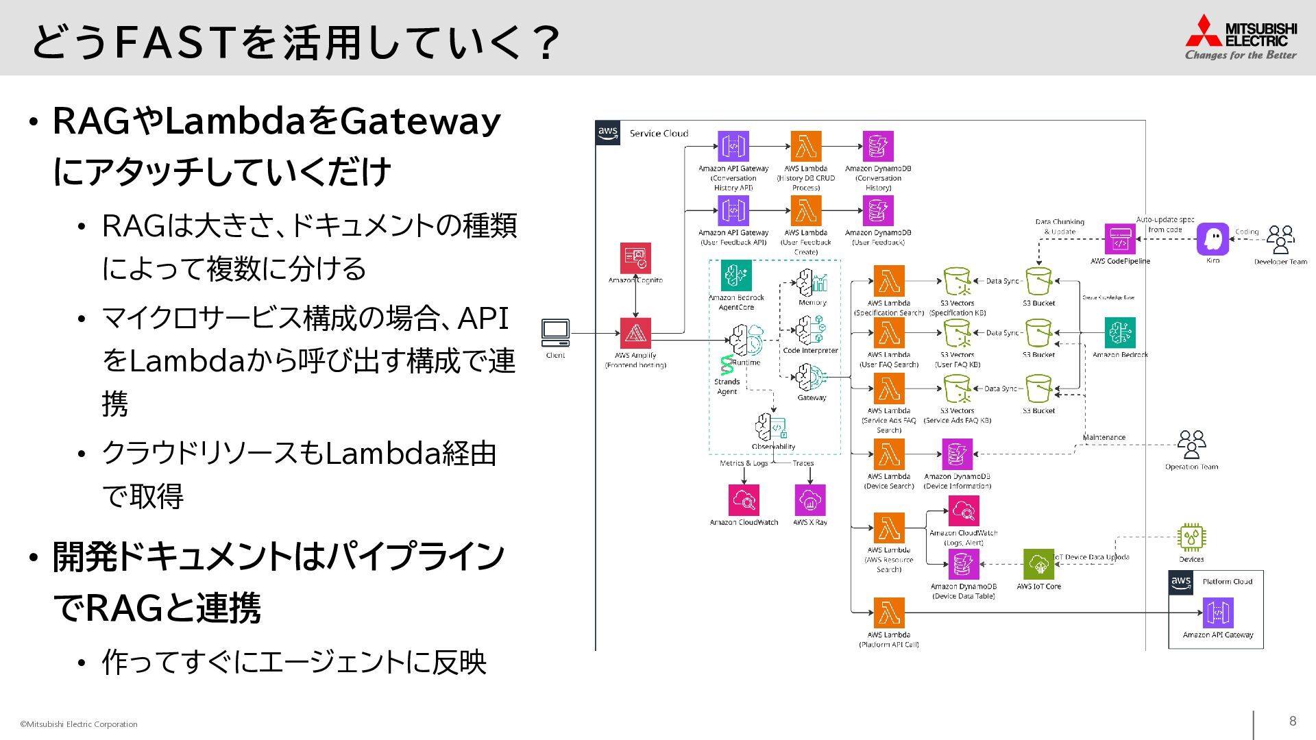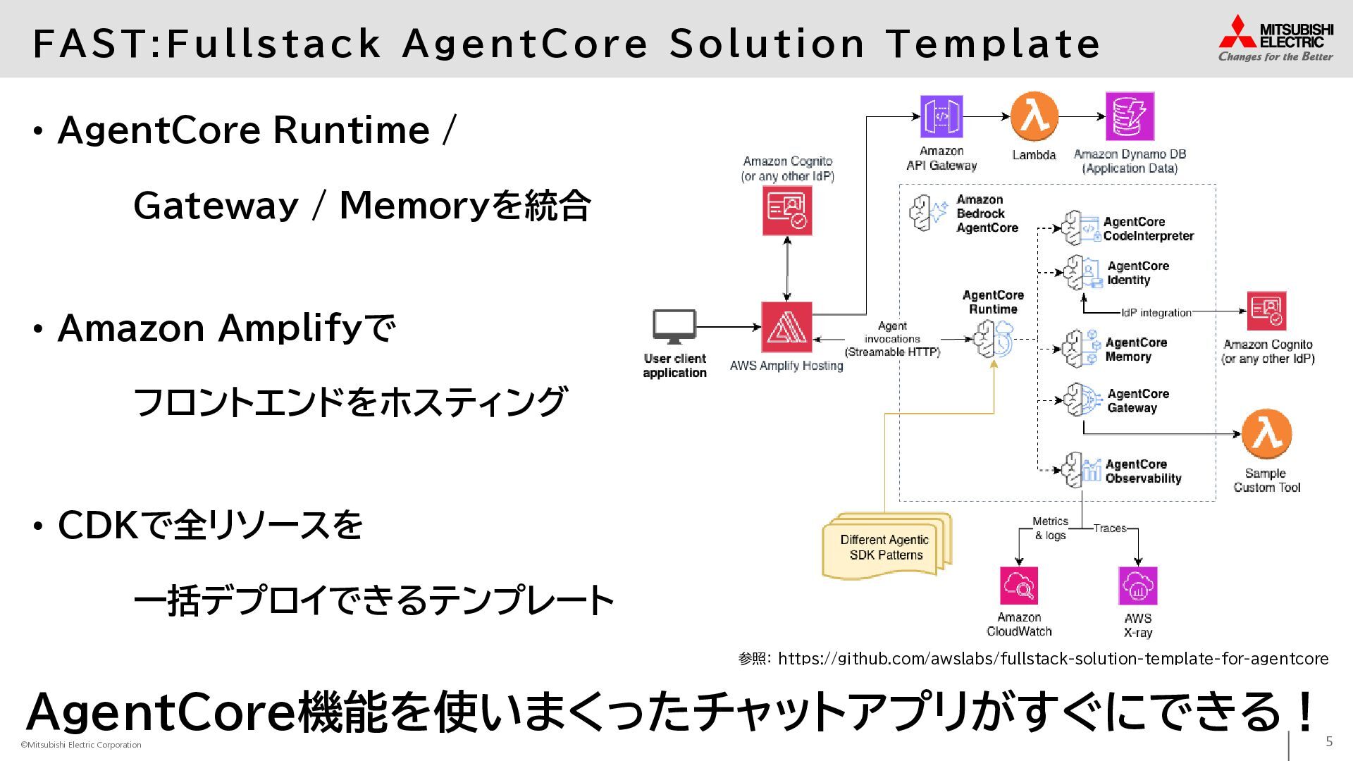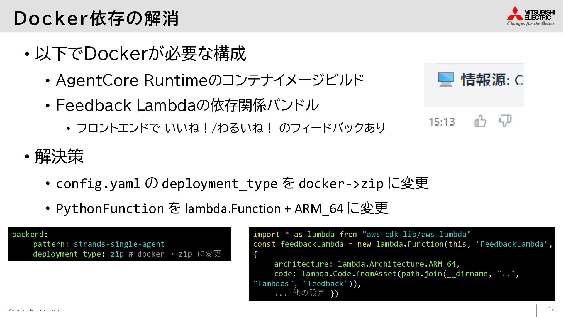 Feedback Lambdaの依存関係バンドル • フロントエンドで いいね!/わるいね! のフィードバックあり • 解決策 • config.yaml の deployment_type を docker->zip に変更 • PythonFunction を lambda.Function + ARM_64 に変更 Docker依存の解消 backend: pattern: strands-single-agent deployment_type: zip # docker → zip に変更 import * as lambda from "aws-cdk-lib/aws-lambda" const feedbackLambda = new lambda.Function(this, "FeedbackLambda", { architecture: lambda.Architecture.ARM_64, code: lambda.Code.fromAsset(path.join(__dirname, "..", "lambdas", "feedback")), ... 他の設定 })
