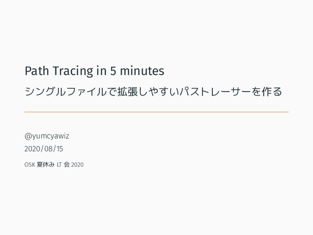 Slide for OSK Summer 2020 Lightning Talk. Code is available at https://github.com/yumcyaWiz/pathtracing_in_5minutes Choose summer_lt_2020 tag to make codes consistent with this slide.