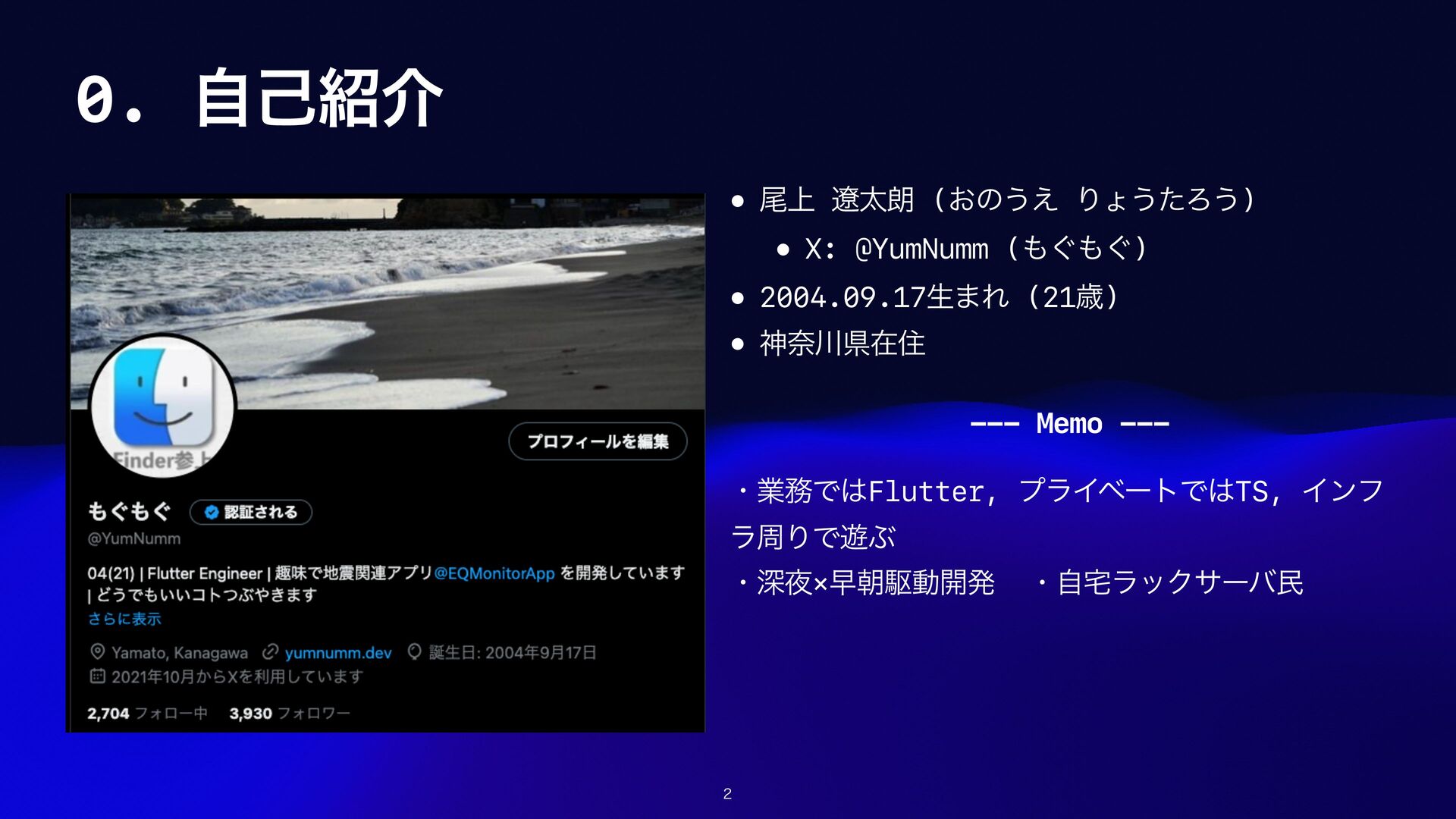 @YumNumm (͙͙) • 2004.09.17ੜ·Ε (21ࡀ) • ਆಸݝࡏॅ --- Memo --- ɾۀͰFlutter, ϓϥΠϕʔτͰTS, Πϯϑ ϥपΓͰ༡Ϳ ɾਂ×ૣேۦಈ։ൃ ɾࣗϥοΫαʔόຽ