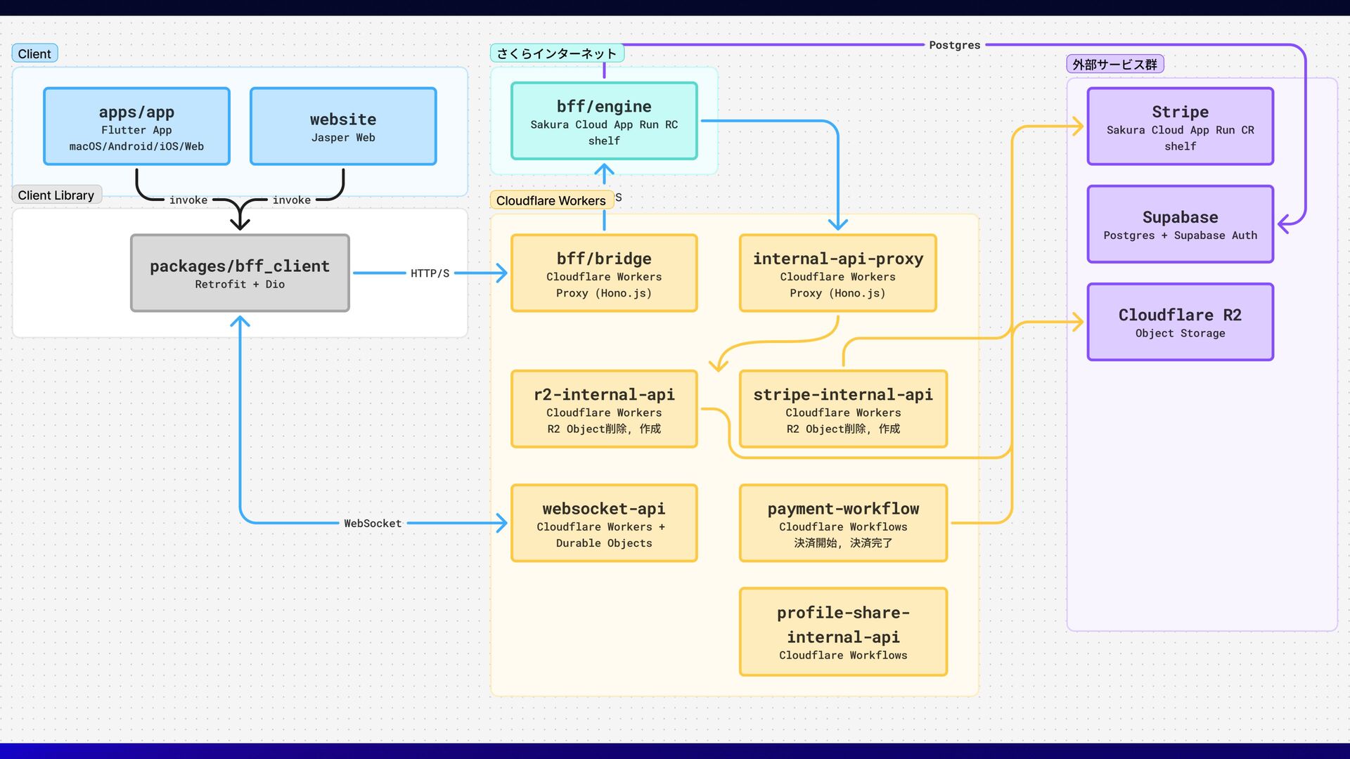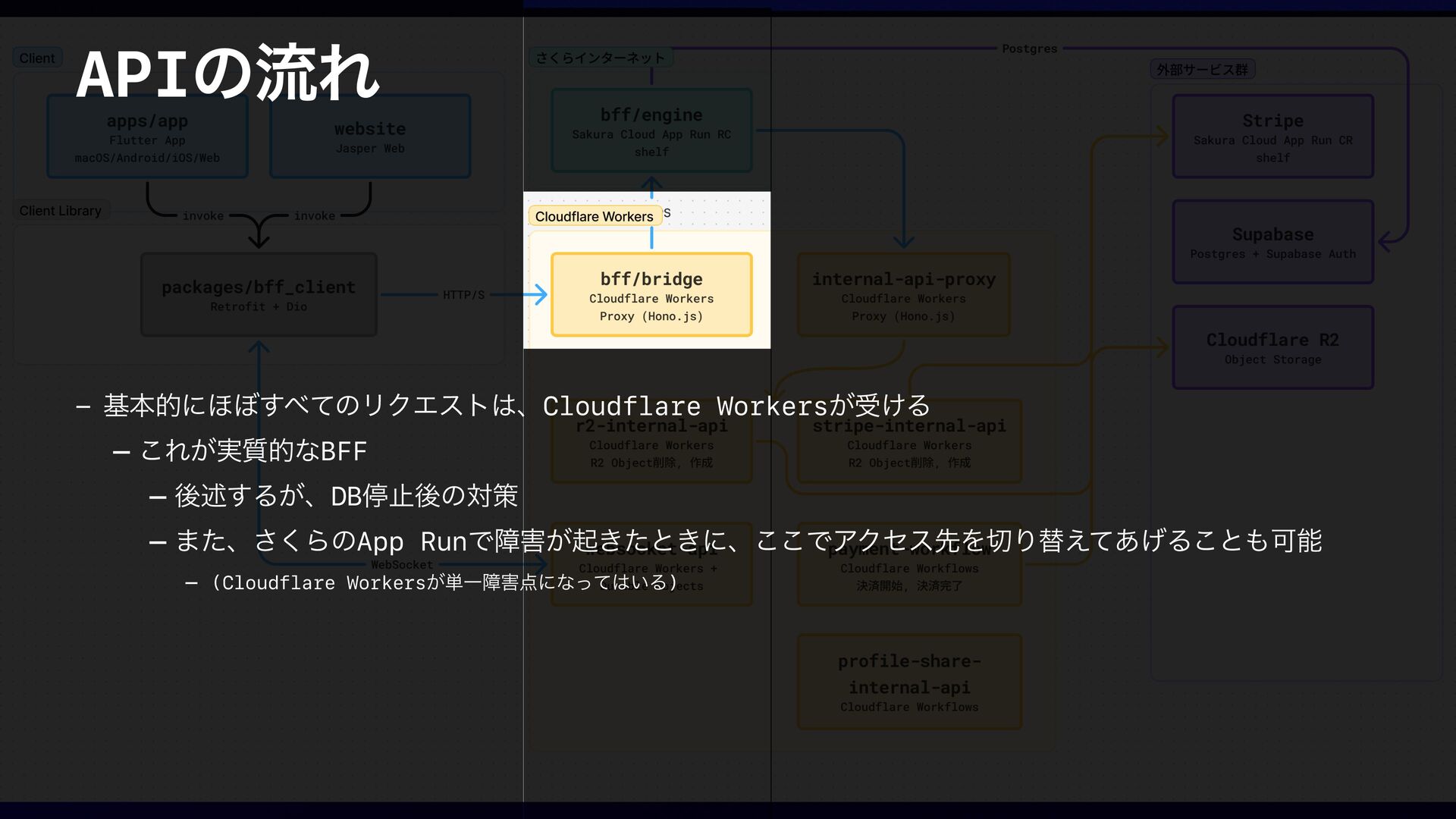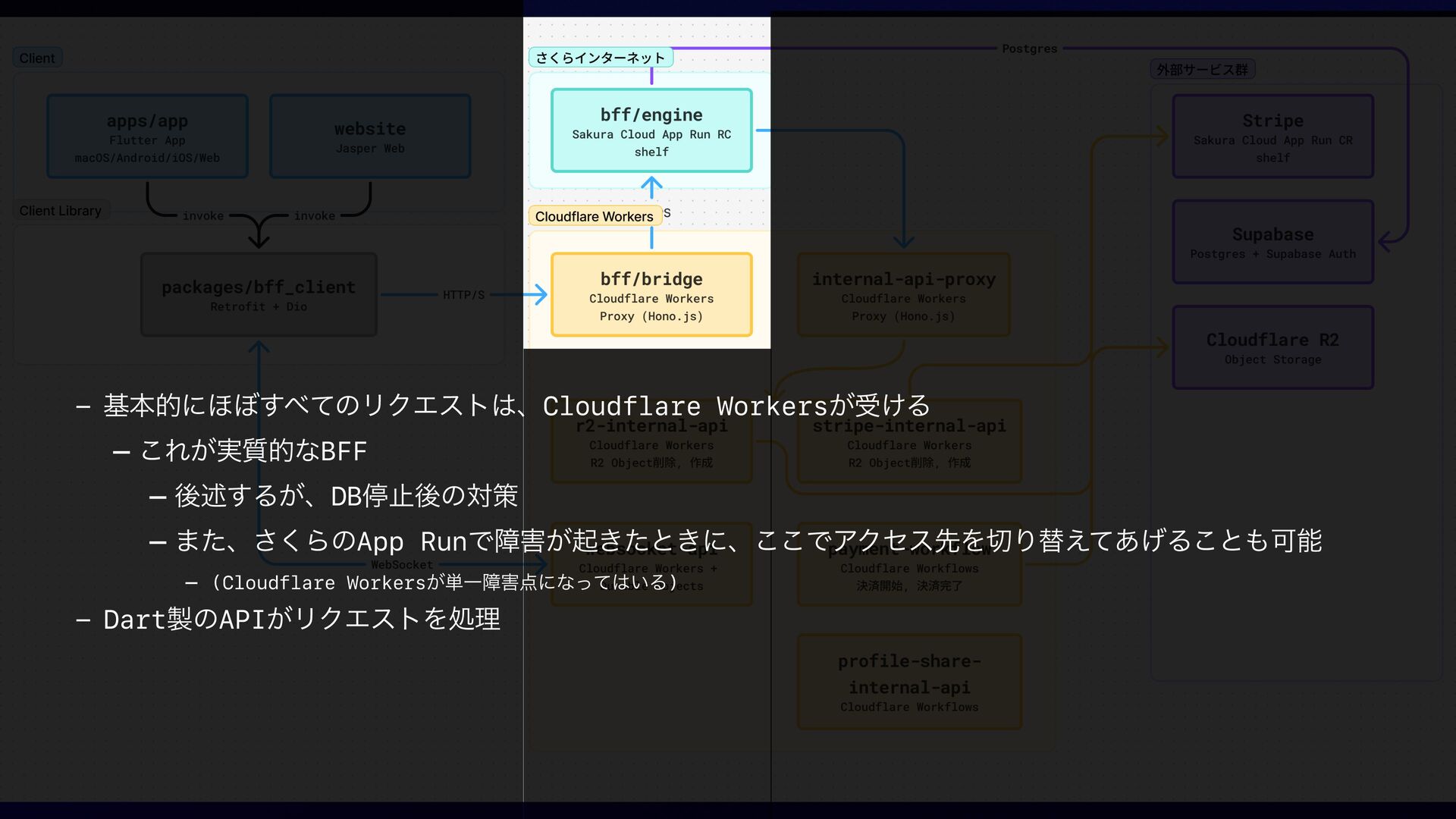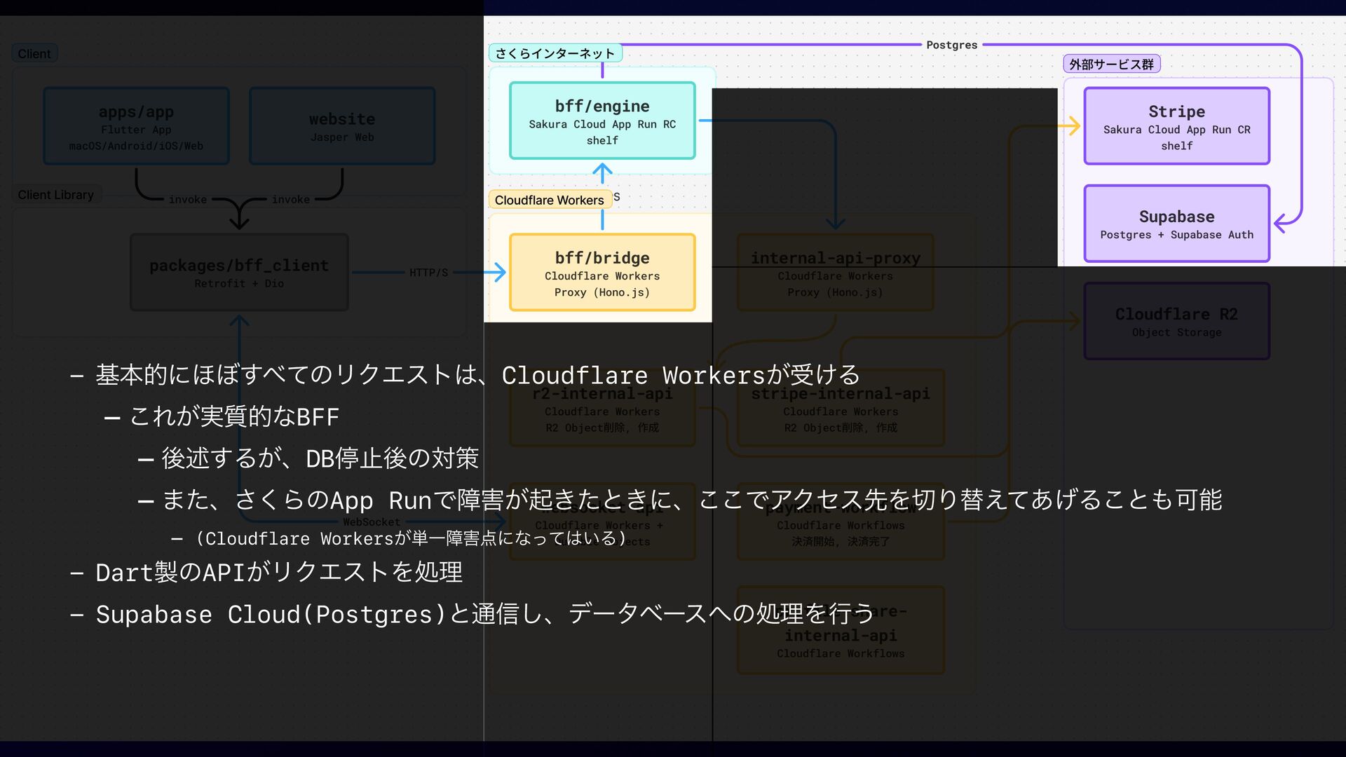 ·ͨɺ͘͞ΒͷApp RunͰো͕ى͖ͨͱ͖ʹɺ͜͜ͰΞΫηεઌΛΓସ͑ͯ͋͛Δ͜ͱՄೳ - (Cloudflare Workers͕୯Ұোʹͳ͍ͬͯΔ) - DartͷAPI͕ϦΫΤετΛॲཧ - Supabase Cloud(Postgres)ͱ௨৴͠ɺσʔλϕʔεͷॲཧΛߦ͏
