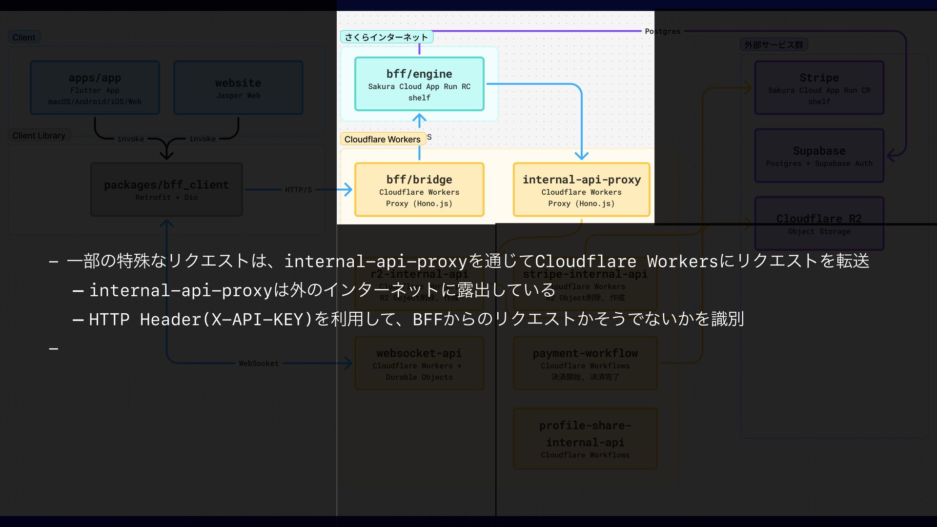 APIߏ - Ұ෦ͷಛघͳϦΫΤετɺinternal-api-proxyΛ௨ͯ͡Cloudflare WorkersʹϦΫΤετΛసૹ - internal-api-proxy֎ͷΠϯλʔωοτʹ࿐ग़͍ͯ͠Δ - HTTP Header(X-API-KEY)Λར༻ͯ͠ɺBFF͔ΒͷϦΫΤετ͔ͦ͏Ͱͳ͍͔Λࣝผ