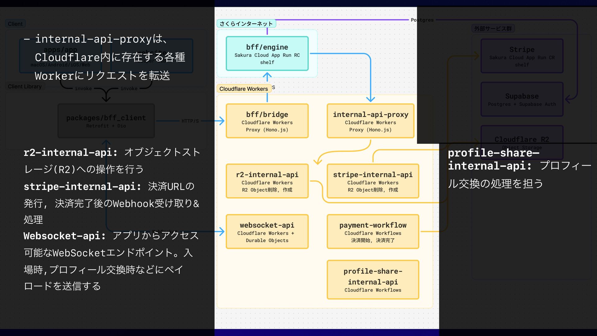 APIߏ - internal-api-proxyɺ Cloudflareʹଘࡏ͢Δ֤छ WorkerʹϦΫΤετΛసૹ r2-internal-api: ΦϒδΣΫτετ Ϩʔδ(R2)ͷૢ࡞Λߦ͏ stripe-internal-api: