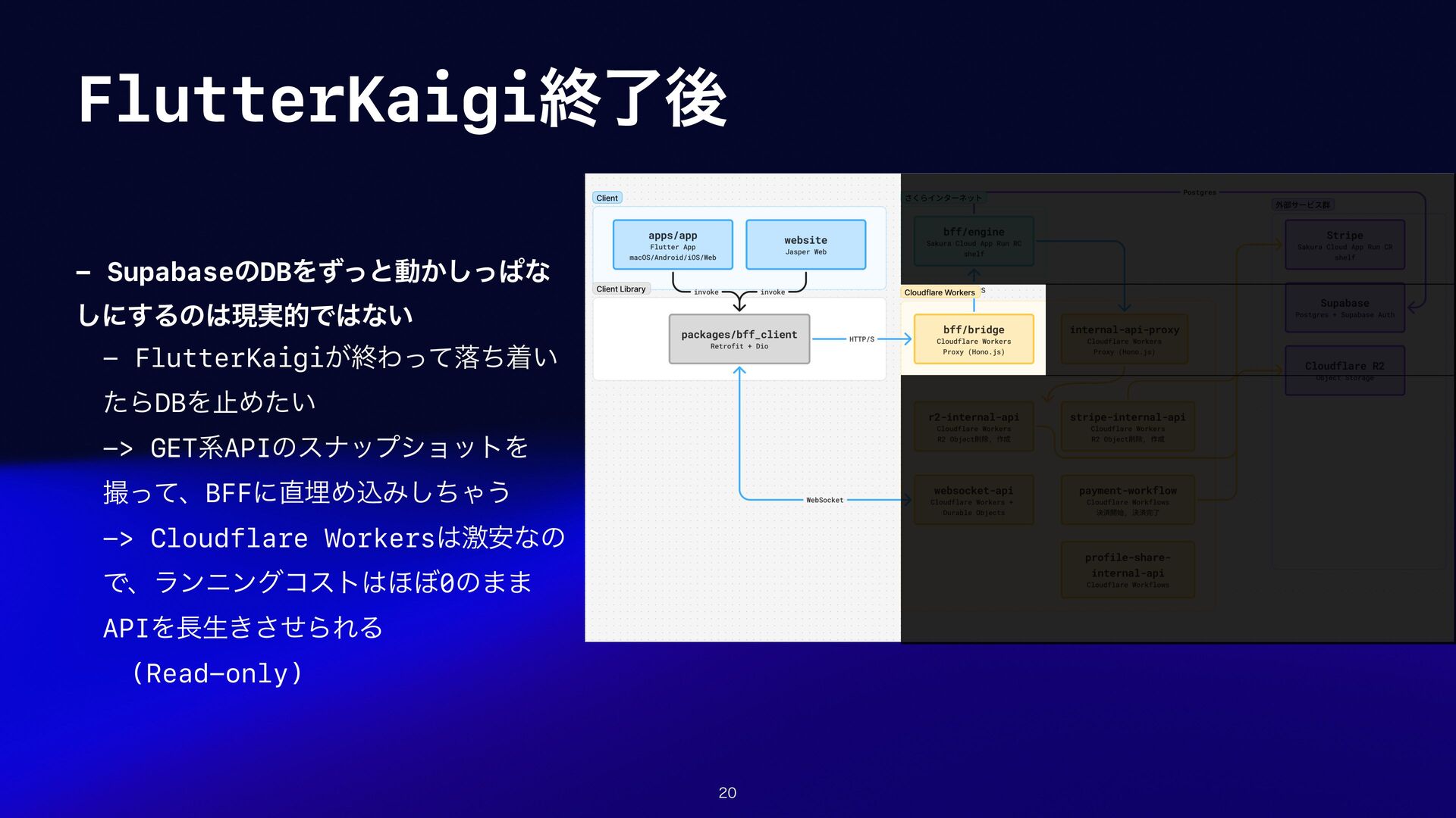 FlutterKaigiऴྃޙ - SupabaseͷDBΛͣͬͱಈ͔ͬ͠ͺͳ ͠ʹ͢Δͷݱ࣮తͰͳ͍ - FlutterKaigi͕ऴΘͬͯམͪண͍ ͨΒDBΛࢭΊ͍ͨ -> GETܥAPIͷεφοϓγϣοτΛ ࡱͬͯɺBFFʹຒΊࠐΈͪ͠Ό͏