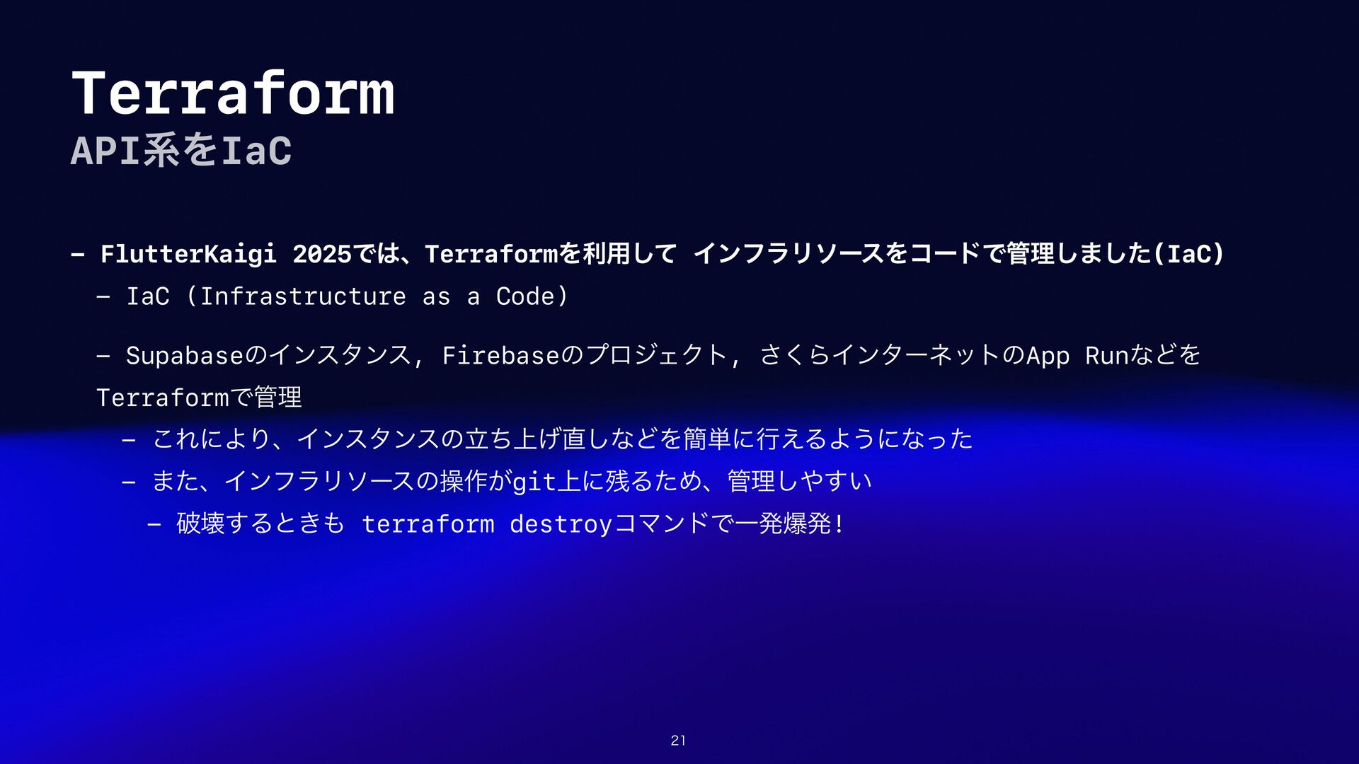 Terraform APIܥΛIaC - FlutterKaigi 2025ͰɺTerraformΛར༻ͯ͠ ΠϯϑϥϦιʔεΛίʔυͰཧ͠·ͨ͠(IaC) - IaC (Infrastructure as