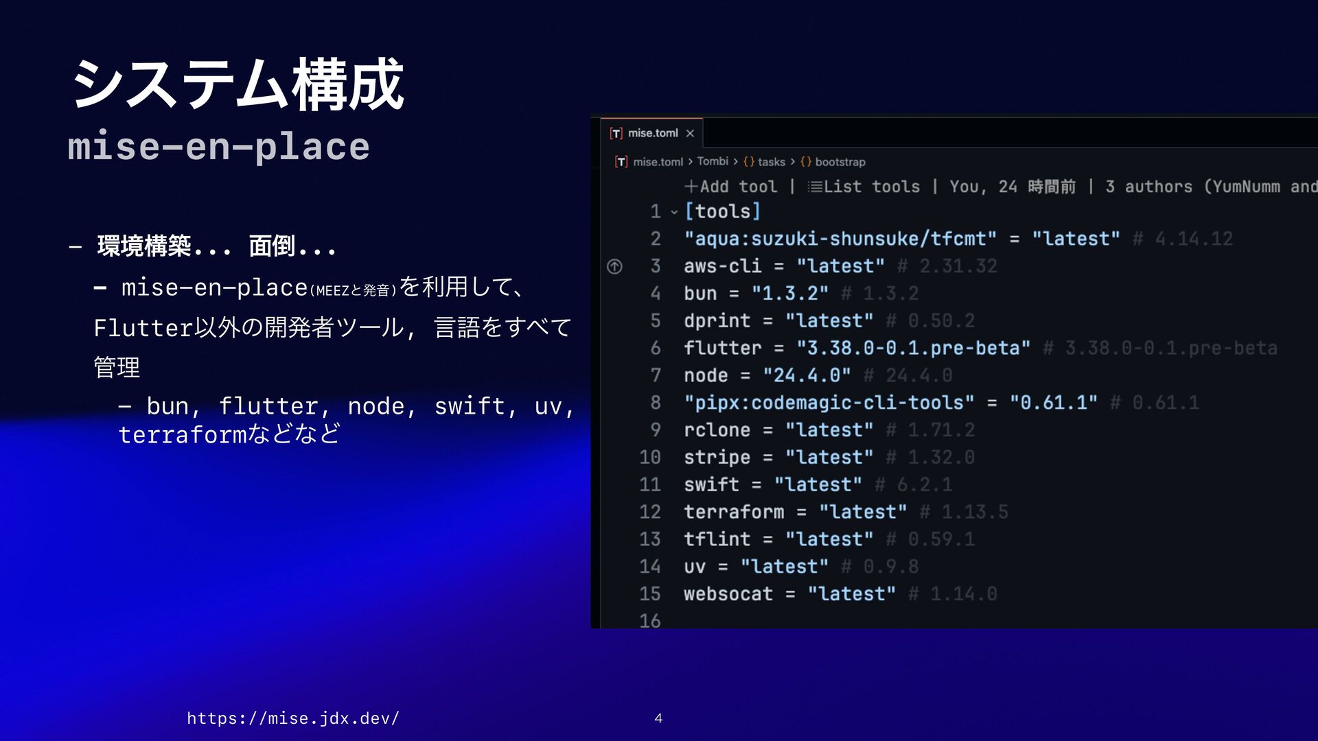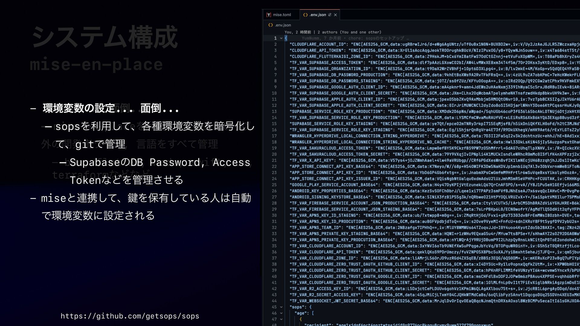 bun, flutter, node, swift, uv, terraformͳͲͳͲ - ڥมͷઃఆ... ໘... - sopsΛར༻ͯ͠ɺ֤छڥมΛ҉߸Խ͠ ͯɺgitͰཧ - SupabaseͷDB Password, Access TokenͳͲΛཧͤ͞Δ - miseͱ࿈ܞͯ͠ɺ伴Λอ༗͍ͯ͠Δਓࣗಈ Ͱڥมʹઃఆ͞ΕΔ https://github.com/getsops/sops