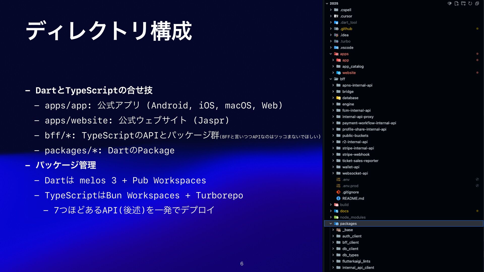 apps/website: ެࣜΣϒαΠτ (Jaspr) - bff/*: TypeScriptͷAPIͱύοέʔδ܈(BFFͱݴ͍ͭͭAPIͳͷποί·ͳ͍Ͱ΄͍͠) - packages/*: DartͷPackage - ύοέʔδཧ - Dart melos 3 + Pub Workspaces - TypeScriptBun Workspaces + Turborepo - 7ͭ΄Ͳ͋ΔAPI(ޙड़)ΛҰൃͰσϓϩΠ σΟϨΫτϦߏ