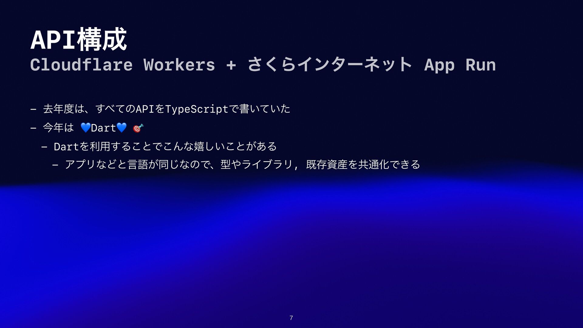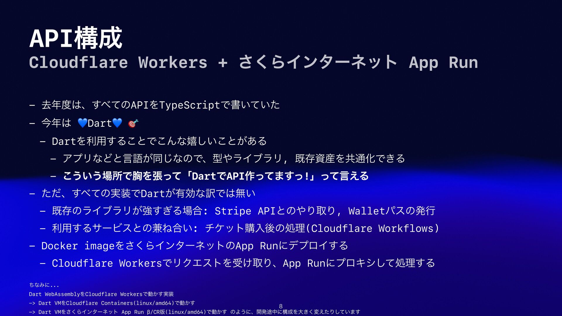 ࠓ 💙Dart💙 🎯 - DartΛར༻͢Δ͜ͱͰ͜Μͳخ͍͜͠ͱ͕͋Δ - ΞϓϦͳͲͱݴޠ͕ಉ͡ͳͷͰɺܕϥΠϒϥϦ, طଘࢿ࢈Λڞ௨ԽͰ͖Δ - ͜͏͍͏ॴͰڳΛுͬͯʮDartͰAPI࡞ͬͯ·ͬ͢!ʯͬͯݴ͑Δ - ͨͩɺͯ͢ͷ࣮ͰDart͕༗ޮͳ༁Ͱແ͍ - طଘͷϥΠϒϥϦ͕ڧ͗͢Δ߹: Stripe APIͱͷΓऔΓ, Walletύεͷൃߦ - ར༻͢ΔαʔϏεͱͷ݉Ͷ߹͍: νέοτߪೖޙͷॲཧ(Cloudflare Workflows) - Docker imageΛ͘͞ΒΠϯλʔωοτͷApp RunʹσϓϩΠ͢Δ - Cloudflare WorkersͰϦΫΤετΛड͚औΓɺApp RunʹϓϩΩγͯ͠ॲཧ͢Δ ͪͳΈʹ... Dart WebAssemblyΛCloudflare WorkersͰಈ͔࣮͢ -> Dart VMΛCloudflare Containers(linux/amd64)Ͱಈ͔͢ -> Dart VMΛ͘͞ΒΠϯλʔωοτ App Run β/CR൛(linux/amd64)Ͱಈ͔͢ ͷΑ͏ʹɺ։ൃ్தʹߏΛେ͖͘ม͑ͨΓ͍ͯ͠·͢