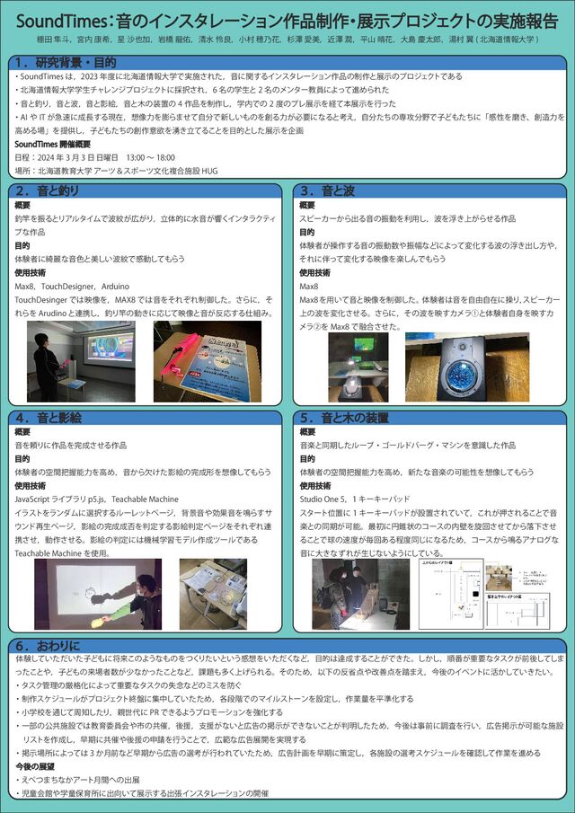 ɼ ʹւಓใେֶͰ࣮ࢪ͞ΕͨɼԻʹؔ͢ΔΠϯελϨʔγϣϯ࡞ͷ੍࡞ͱలࣔͷϓϩδΣΫ τͰ͋Δ ɾւಓใେֶֶੜνϟϨϯδϓϩδΣΫ τʹ࠾͞Εɼ ໊ͷֶੜͱ ໊ͷϝϯλʔڭһʹΑͬͯਐΊΒΕͨ ɾԻͱΓɼԻͱɼԻͱӨֆɼԻͱͷஔͷ ࡞Λ੍࡞͠ɼֶͰͷ ͷϓϨలࣔΛܦͯຊలࣔΛߦͬͨ ɾ"* *5 ͕ٸʹ͢Δݱࡏɼ૾ྗΛΒ·ͤͯࣗͰ৽͍͠ͷΛΔྗ͕ඞཁʹͳΔͱߟ͑ɼࣗͨͪͷઐ߈ͰࢠͲͨͪʹʮײੑΛຏ͖ɺྗΛ ߴΊΔʯΛఏڙ͠ɼࢠͲͨͪͷ࡞ҙཉΛཱ༙͖ͯΔ͜ͱΛతͱͨ͠లࣔΛاը 4PVOE5JNFT ։࠵֓ཁ ఔɿ ݄ ༵ɹ ʙ ॴɿւಓڭҭେֶΞʔπˍεϙʔπจԽෳ߹ࢪઃ)6( ̒ɽ͓ΘΓʹ ମݧ͍͍ͯͨͩͨ͠ࢠͲʹকདྷ͜ͷΑ͏ͳͷΛͭ͘ Γ͍ͨͱ͍͏ײΛ͍ͨͩ͘ͳͲɼతୡ͢Δ͜ͱ͕Ͱ͖ͨɻ͔͠͠ɼॱ൪͕ॏཁͳλεΫ͕લޙͯ͠͠· ͬͨ͜ͱɼࢠͲͷདྷऀ͕গͳ͔ͬͨ͜ͱͳͲɼ՝ଟ্͛͘ΒΕΔɻͦͷͨΊɼҎԼͷলվળΛ౿·͑ɼࠓޙͷΠϕϯτʹ׆͔͍͖͍ͯͨ͠ɻ ɾλεΫཧͷݫ֨ԽʹΑͬͯॏཁͳλεΫͷࣦ೦ͳͲͷϛεΛ͙ ɾ੍࡞εέδϡʔϧ͕ϓϩδΣΫ τऴ൫ʹूத͍ͯͨͨ͠Ίɼ֤ஈ֊ͰͷϚΠϧετʔϯΛઃఆ͠ɼ࡞ۀྔΛฏ४Խ͢Δ ɾখֶߍΛ௨ͯ͡पͨ͠Γɼੈʹ 13Ͱ͖ΔΑ͏ϓϩϞʔγϣϯΛڧԽ͢Δ ɾҰ෦ͷެڞࢪઃͰڭҭҕһձࢢͷڞ࠵ɼޙԉɼࢧԉ͕ͳ͍ͱࠂͷܝ͕ࣔͰ͖ͳ͍͜ͱ͕໌ͨͨ͠ΊɼࠓޙࣄલʹௐࠪΛߦ͍ɼࠂܝ͕ࣔՄೳͳࢪઃ ɹϦετΛ࡞͠ɼૣظʹڞ࠵ޙԉͷਃΛߦ͏͜ͱͰɼൣͳࠂల։Λ࣮ݱ͢Δ ɾܝࣔॴʹΑ͔݄ͬͯલͳͲૣظ͔Βࠂͷબߟ͕ߦΘΕ͍ͯͨͨΊɼࠂܭըΛૣظʹࡦఆ͠ɼ֤ࢪઃͷબߟεέδϡʔϧΛ֬ೝͯ͠࡞ۀΛਐΊΔ ࠓޙͷల ɾ͑ͭ·ͪͳ͔Ξʔτ݄ؒͷग़ల ɾࣇಐձֶؗಐอҭॴʹग़͍ͯలࣔ͢Δग़ுΠϯελϨʔγϣϯͷ։࠵ ̎ɽԻͱΓ ֓ཁ ΛৼΔͱϦΞϧλΠϜͰ͕͕ΓɼཱମతʹਫԻ͕ڹ͘ΠϯλϥΫςΟ ϒͳ࡞ త ମݧऀʹ៉ྷͳԻ৭ͱඒ͍͠Ͱײಈͯ͠Β͏ ༻ٕज़ .BYɼ5PVDI%FTJHOFSɼ"SEVJOP 5PVDI%FTJOHFS Ͱө૾Λɼ."9 ͰԻΛͦΕͧΕ੍ޚͨ͠ɻ͞Βʹɼͦ ΕΒΛ "SVEJOP ͱ࿈ܞ͠ɼΓͷಈ͖ʹԠͯ͡ө૾ͱԻ͕Ԡ͢ΔΈɻ ̏ɽԻͱ ֓ཁ εϐʔΧʔ͔Βग़ΔԻͷৼಈΛར༻͠ɼΛු্͖͕ΒͤΔ࡞ త ମݧऀ͕ૢ࡞͢ΔԻͷৼಈৼ෯ͳͲʹΑͬͯมԽ͢Δͷු͖ग़͠ํɼ ͦΕʹͬͯมԽ͢Δө૾Λָ͠ΜͰΒ͏ ༻ٕज़ .BY .BYΛ༻͍ͯԻͱө૾Λ੍ޚͨ͠ɻ ମݧऀԻΛࣗ༝ࣗࡏʹૢΓɼ εϐʔΧʔ ্ͷΛมԽͤ͞Δɻ͞ΒʹɼͦͷΛө͢ΧϝϥᶃͱମݧऀࣗΛө͢Χ ϝϥᶄΛ .BY Ͱ༥߹ͤͨ͞ɻ ̐ɽԻͱӨֆ ֓ཁ ԻΛཔΓʹ࡞Λͤ͞Δ࡞ త ମݧऀͷۭؒѲೳྗΛߴΊɼԻ͔Β͚ܽͨӨֆͷܗΛ૾ͯ͠Β͏ ༻ٕज़ +BWB4DSJQUϥΠϒϥϦ QKTɼ5FBDIBCMF.BDIJOF ΠϥετΛϥϯμϜʹબ͢ΔϧʔϨο τϖʔδɼഎܠԻޮՌԻΛ໐Β͢α ϯυ࠶ੜϖʔδɼӨֆͷ൱Λఆ͢ΔӨֆఆϖʔδΛͦΕͧΕ࿈ ܞͤ͞ɼಈ࡞ͤ͞ΔɻӨֆͷఆʹػցֶशϞσϧ࡞πʔϧͰ͋Δ 5FBDIBCMF.BDIJOF Λ༻ɻ ̑ɽԻͱͷஔ ֓ཁ Իָͱಉظͨ͠ϧʔϒɾΰʔϧυόʔάɾϚγϯΛҙࣝͨ͠࡞ త ମݧऀͷۭؒѲೳྗΛߴΊɼ৽ͨͳԻָͷՄೳੑΛ૾ͯ͠Β͏ ༻ٕज़ 4UVEJP0OFɼ ΩʔΩʔύο υ ελʔτҐஔʹ ΩʔΩʔύο υ͕ઃஔ͞Ε͍ͯͯɼ͜Ε͕ԡ͞ΕΔ͜ͱͰԻ ָͱͷಉظ͕Մೳɻ࠷ॳʹԁਲ਼ঢ়ͷίʔεͷนΛટճ͔ͤͯ͞ΒམԼͤ͞ Δ͜ͱͰٿͷ͕ຖճ͋Δఔಉ͡ʹͳΔͨΊɼίʔε͔Β໐ΔΞφϩάͳ Իʹେ͖ͳͣΕ͕ੜ͡ͳ͍Α͏ʹ͍ͯ͠Δɻ