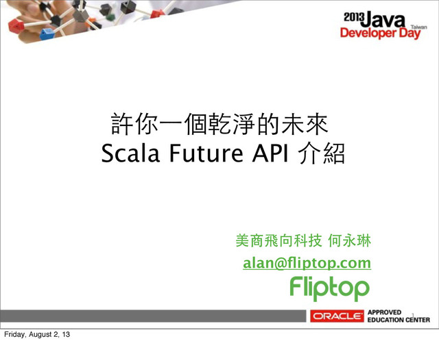 futureB) { 4 return Futures.transform(futureA, new AsyncFunction<Integer, Integer>() { 5 @Override 6 public ListenableFuture<Integer> apply(final Integer resultA) throws Exception { 7 return Futures.transform(futureB, new AsyncFunction<Integer, Integer>() { 8 @Override 9 public ListenableFuture<Integer> apply(Integer resultB) throws Exception { 10 return Futures.immediateCheckedFuture(resultA + resultB); 11 } 12 }); 13 } 14 }); 15} Callback Hell in Guava’s Future public interface AsyncFunction<I, O> { ListenableFuture<O> apply(I input) throws Exception; } static <I,O>ListenableFuture<O> transform( ListenableFuture<I> input, AsyncFunction<? super I,? extends O> function) one line of valuable code with 14 lines of boilerplate Friday, August 2, 13