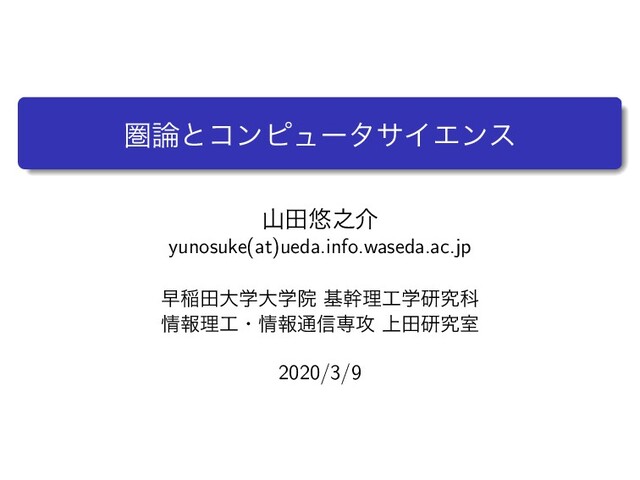 ରɿA, B, C, ... • ࣹɿf, g, h, ... • ҙͷࣹ f ʹରͯ͠ର dom(f), cod(f) ͕͋Δ A = dom(f), B = cod(f) Ͱ͋Δ f Λ f : A → B ͱॻ͘ • ࣹ f : A → B, g : B → C s.t. cod(f) = dom(g) ʹରͯ͠ ࣹ g ◦ f : A → C ͕͋Γɼ ҙͷࣹ f : A → B, g : B → C, h : C → D ʹରͯ͠ h ◦ (g ◦ f) = (h ◦ g) ◦ f ͕Γཱͭ • ҙͷର A ʹରࣹ͠ idA : A → A ͕͋Γɼ ҙͷࣹ f : A → B ʹର͠ f ◦ idA = f = idB ◦ f ͕Γཱͭ 8 / 23