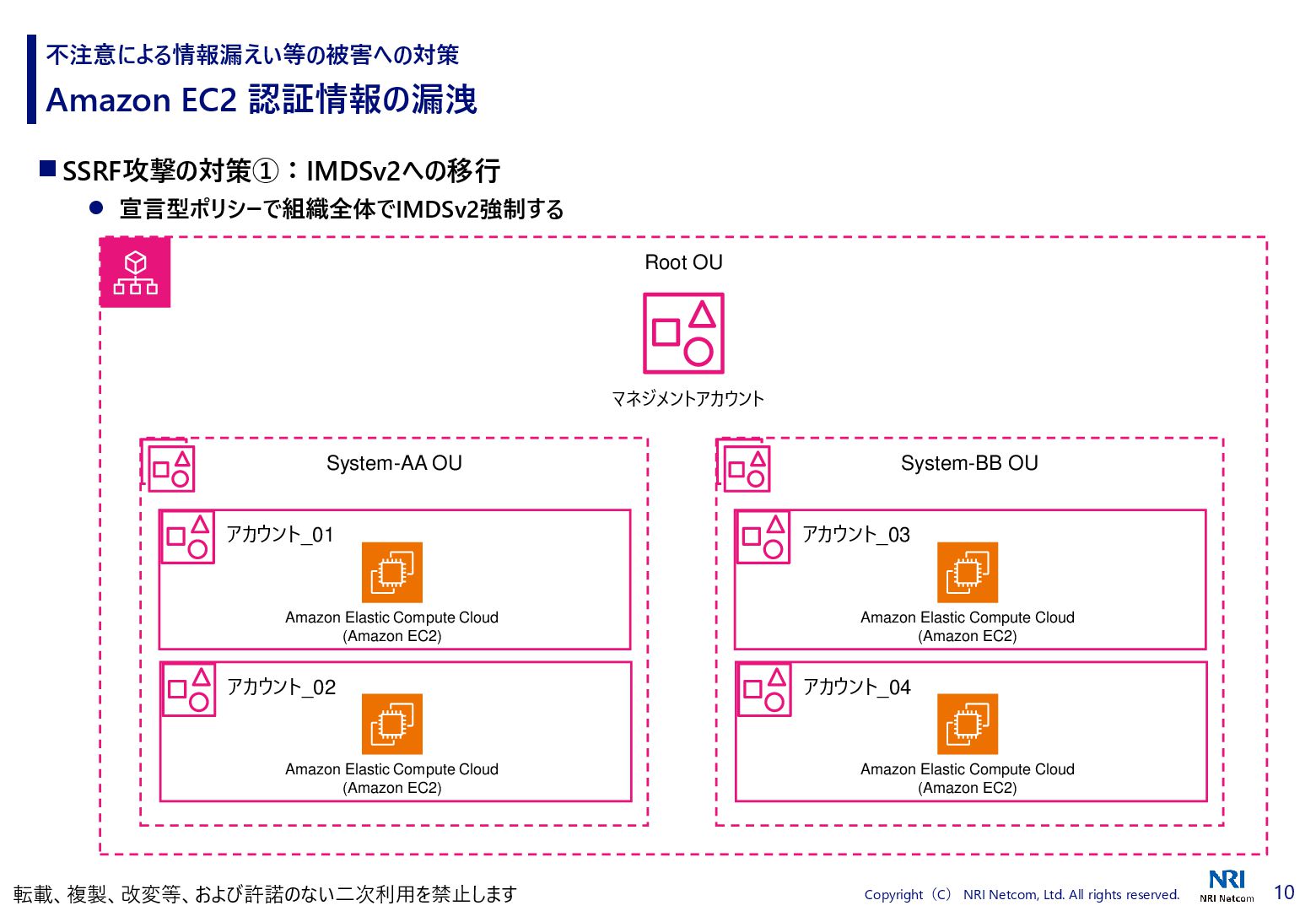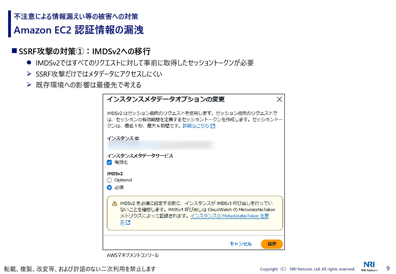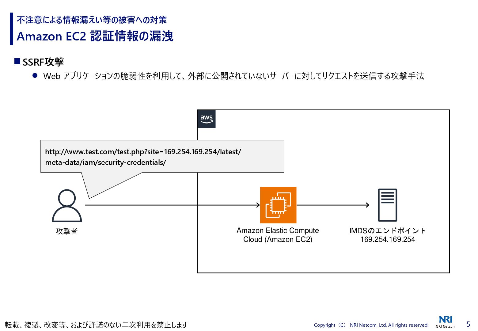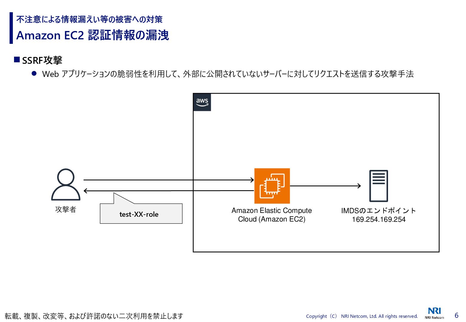 EC2 認証情報の漏洩 不注意による情報漏えい等の被害への対策 ◼ SSRF攻撃 ⚫ Web アプリケーションの脆弱性を利用して、外部に公開されていないサーバーに対してリクエストを送信する攻撃手法 Amazon Elastic Compute Cloud (Amazon EC2) IMDSのエンドポイント 攻撃者 { "Code": "Success", "LastUpdated": "20XX-XX-XXT12:34:56Z", "Type": "AWS-HMAC", "AccessKeyId": “XXXXXXXXXX", "SecretAccessKey": " XXXXXXXXXXXXXXXXXXXX ", "Token": " XXXXXXXXXXXXXXXXXXXX ", "Expiration": "20XX-XX-XXT18:34:56Z" }