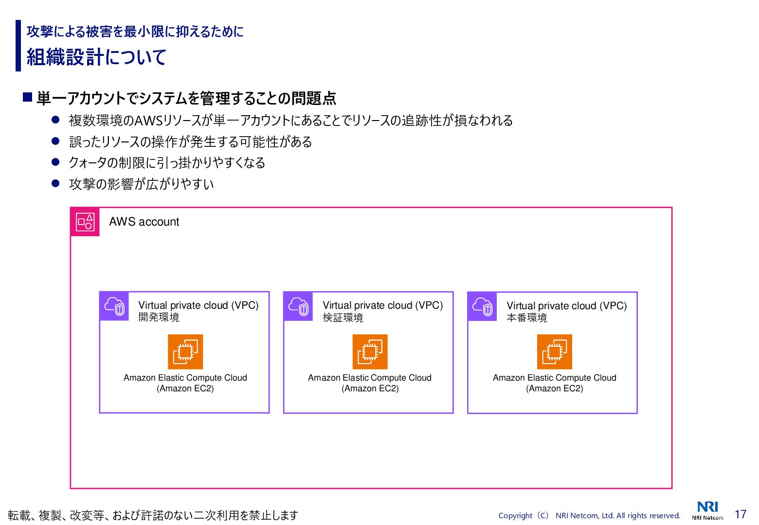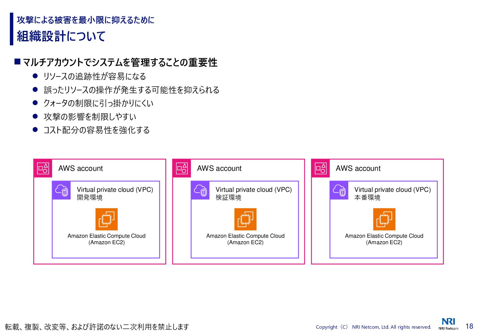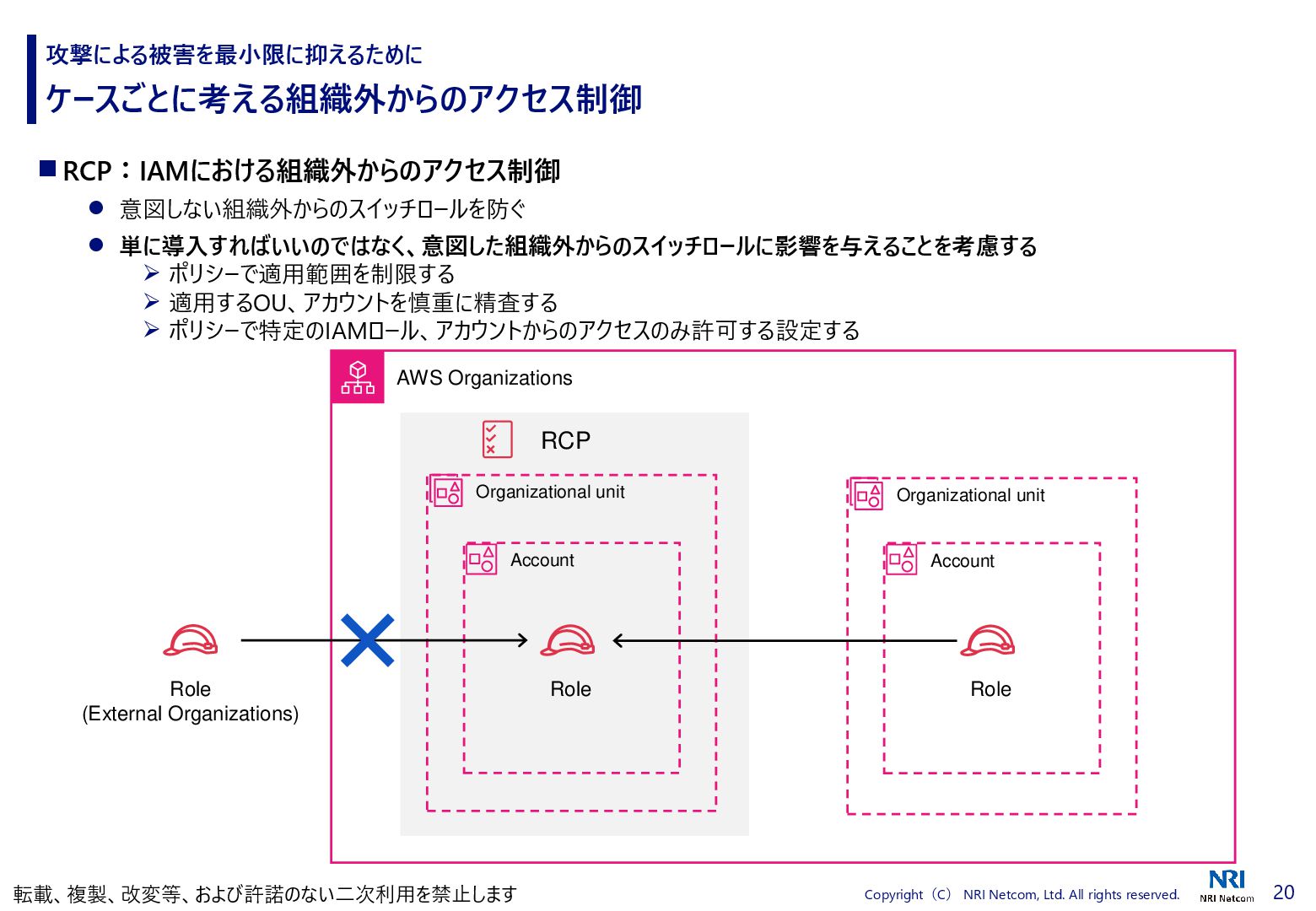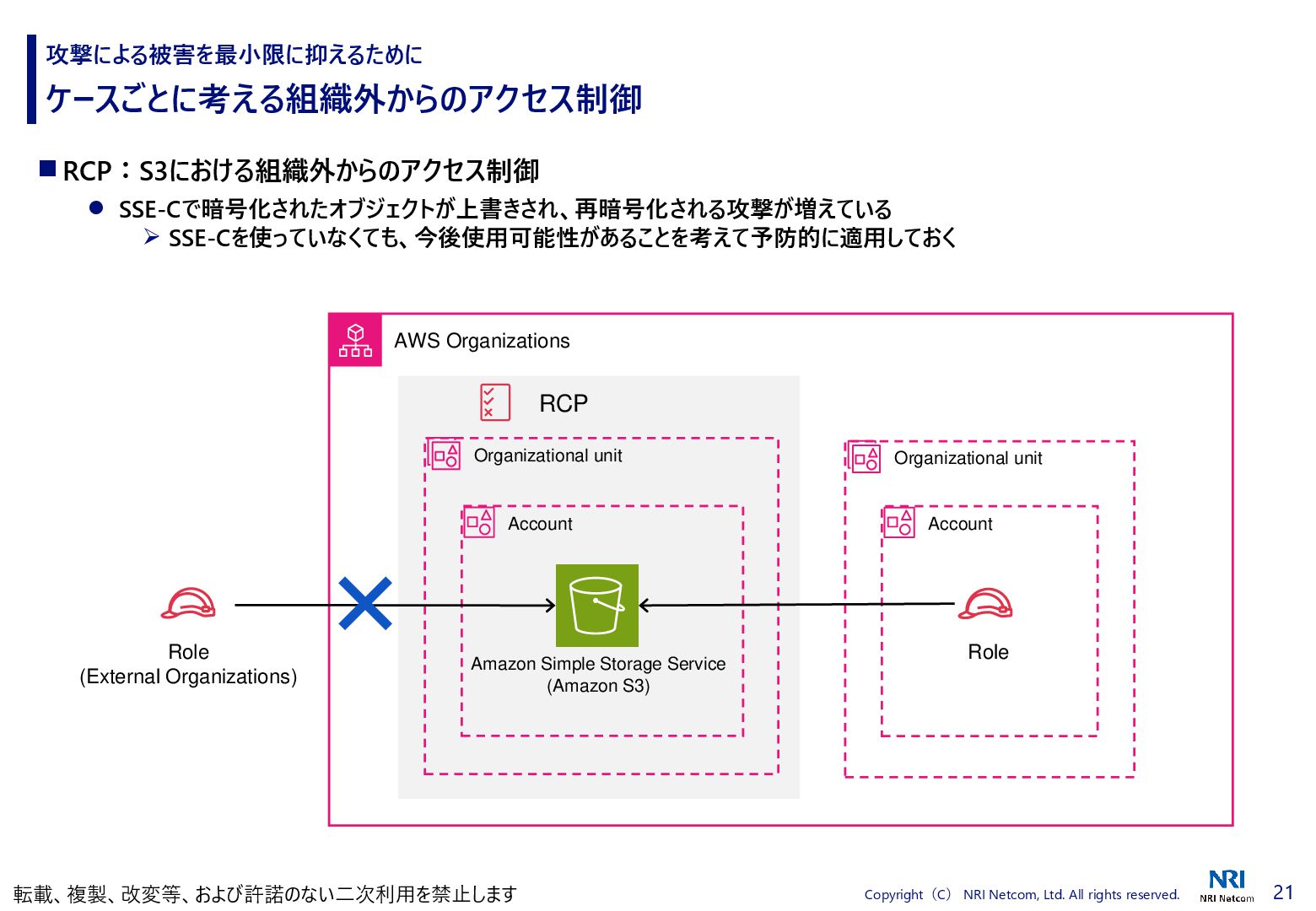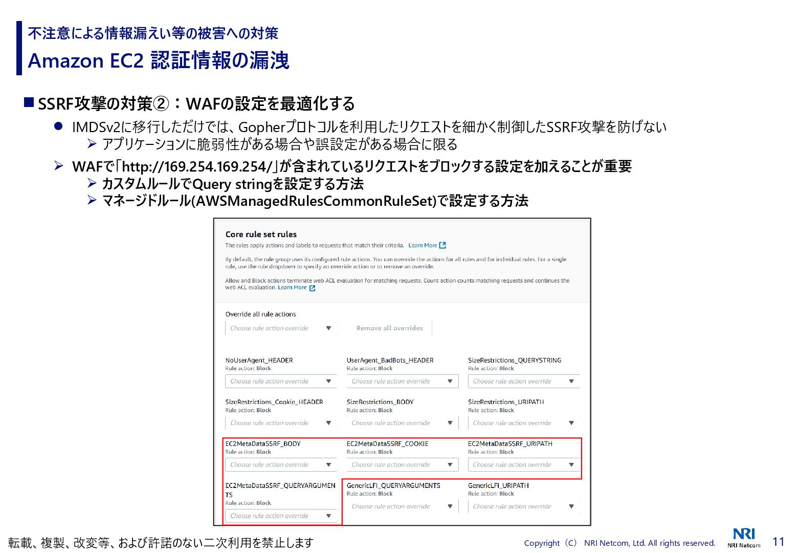 EC2 認証情報の漏洩 不注意による情報漏えい等の被害への対策 ◼ SSRF攻撃 ⚫ Web アプリケーションの脆弱性を利用して、外部に公開されていないサーバーに対してリクエストを送信する攻撃手法 Amazon Elastic Compute Cloud (Amazon EC2) IMDSのエンドポイント 攻撃者 { "Code": "Success", "LastUpdated": "20XX-XX-XXT12:34:56Z", "Type": "AWS-HMAC", "AccessKeyId": “XXXXXXXXXX", "SecretAccessKey": " XXXXXXXXXXXXXXXXXXXX ", "Token": " XXXXXXXXXXXXXXXXXXXX ", "Expiration": "20XX-XX-XXT18:34:56Z" }