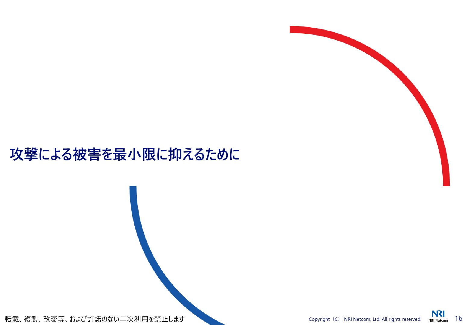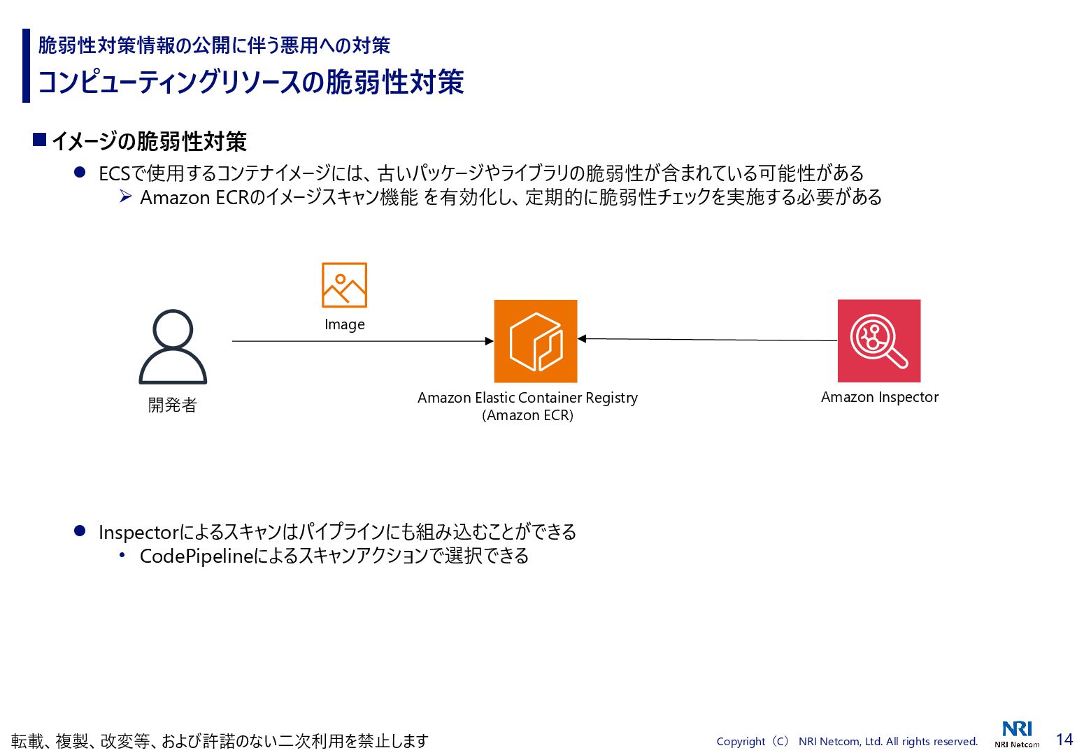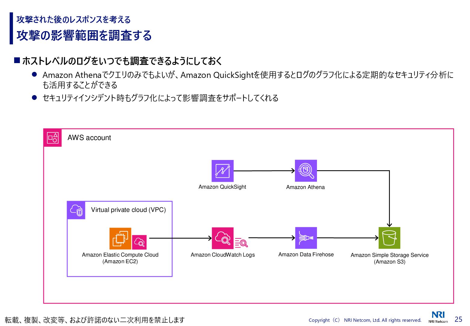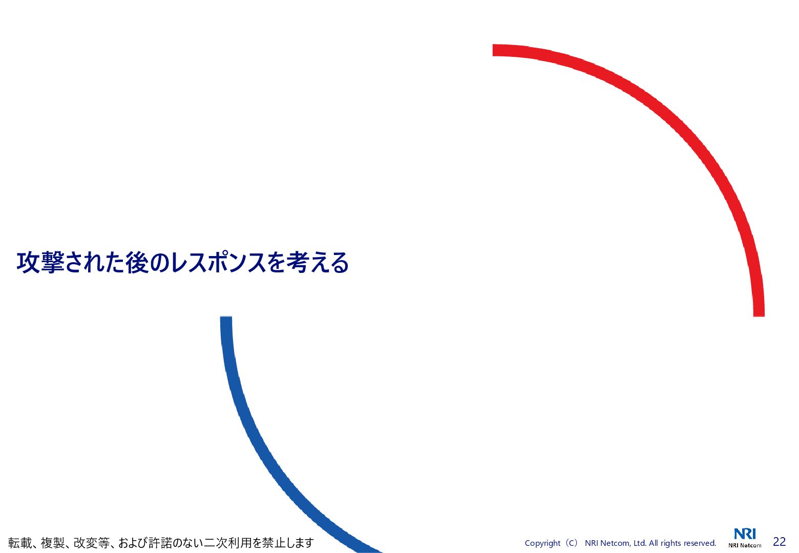 EC2 認証情報の漏洩 不注意による情報漏えい等の被害への対策 ◼ SSRF攻撃 ⚫ Web アプリケーションの脆弱性を利用して、外部に公開されていないサーバーに対してリクエストを送信する攻撃手法 Amazon Elastic Compute Cloud (Amazon EC2) IMDSのエンドポイント 攻撃者 { "Code": "Success", "LastUpdated": "20XX-XX-XXT12:34:56Z", "Type": "AWS-HMAC", "AccessKeyId": “XXXXXXXXXX", "SecretAccessKey": " XXXXXXXXXXXXXXXXXXXX ", "Token": " XXXXXXXXXXXXXXXXXXXX ", "Expiration": "20XX-XX-XXT18:34:56Z" }