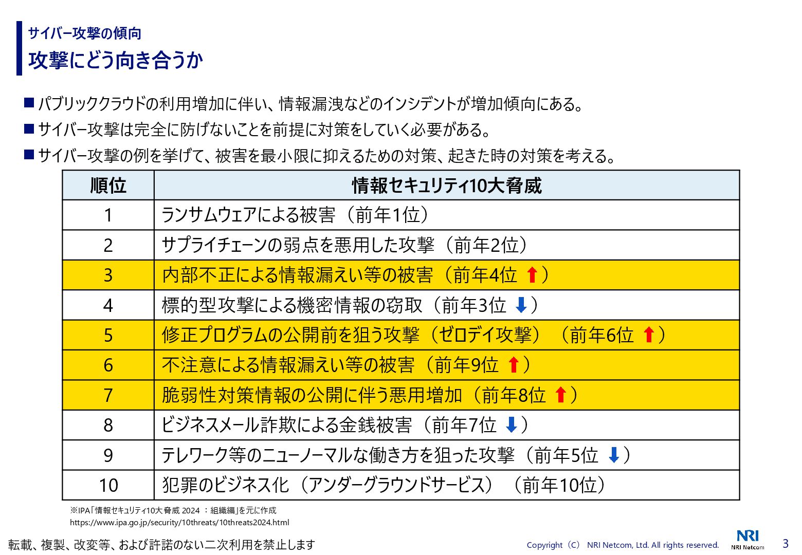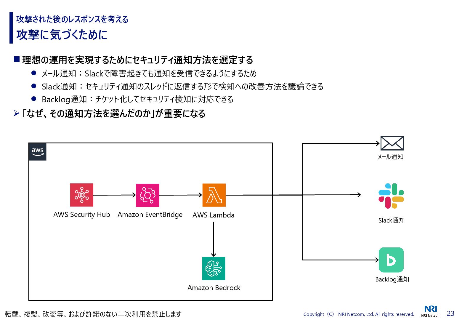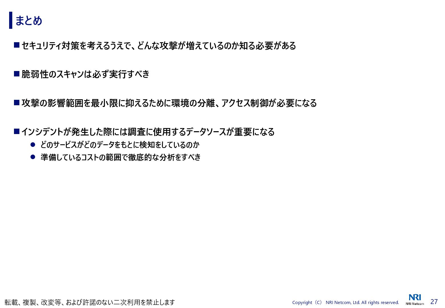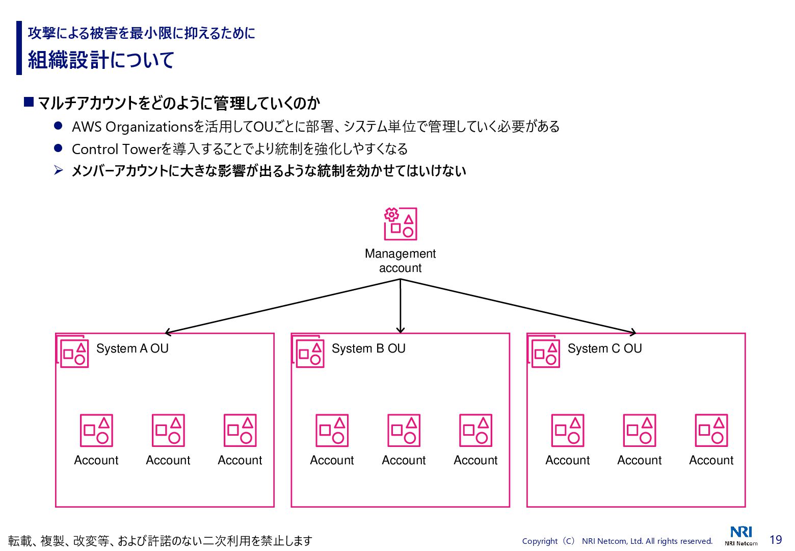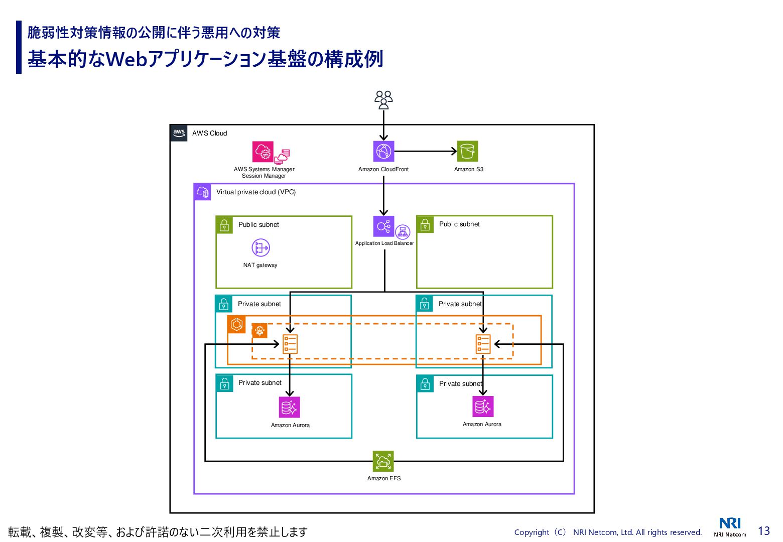 EC2 認証情報の漏洩 不注意による情報漏えい等の被害への対策 ◼ SSRF攻撃 ⚫ Web アプリケーションの脆弱性を利用して、外部に公開されていないサーバーに対してリクエストを送信する攻撃手法 Amazon Elastic Compute Cloud (Amazon EC2) IMDSのエンドポイント 攻撃者 { "Code": "Success", "LastUpdated": "20XX-XX-XXT12:34:56Z", "Type": "AWS-HMAC", "AccessKeyId": “XXXXXXXXXX", "SecretAccessKey": " XXXXXXXXXXXXXXXXXXXX ", "Token": " XXXXXXXXXXXXXXXXXXXX ", "Expiration": "20XX-XX-XXT18:34:56Z" }