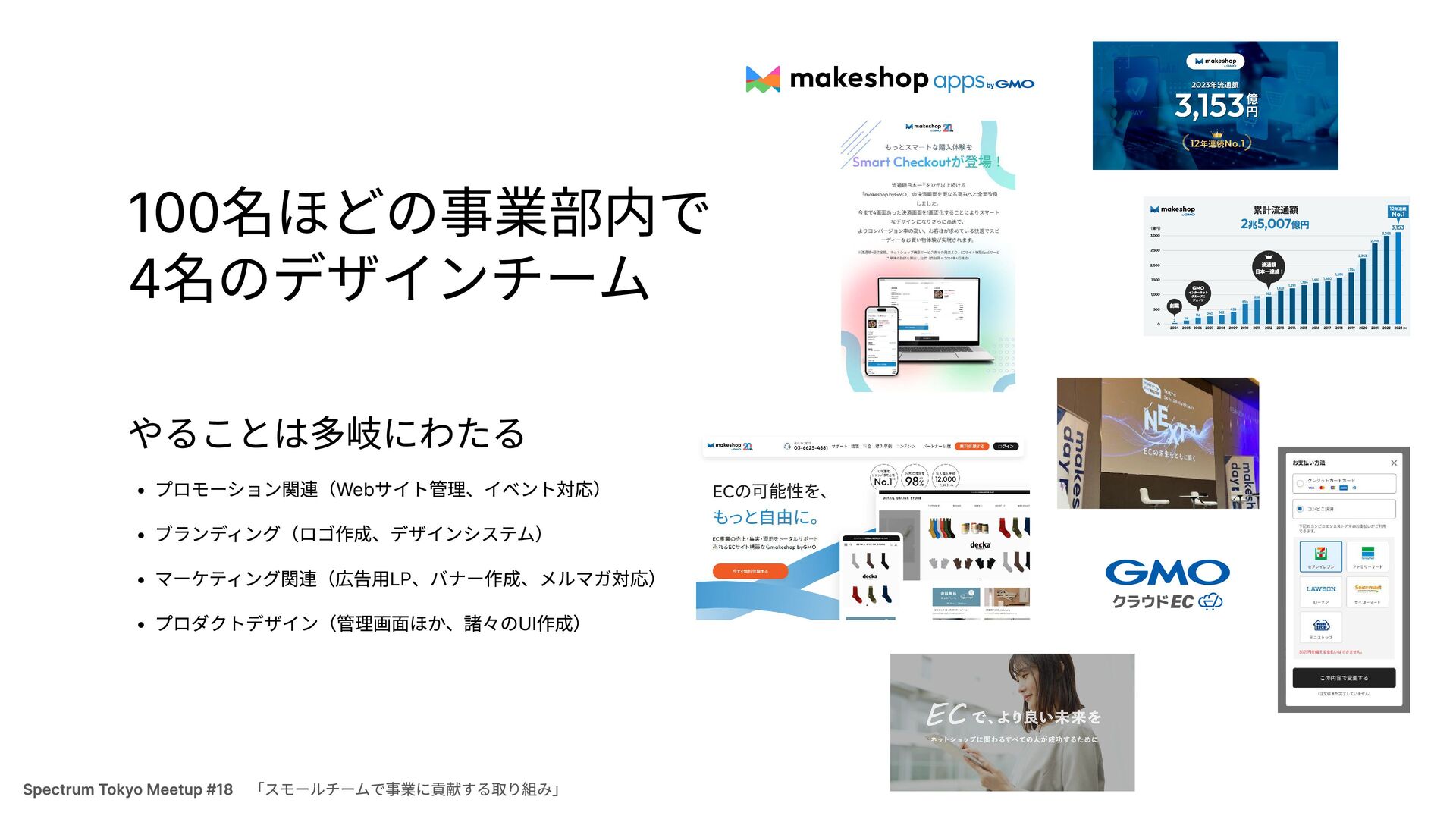1,000 1,500 2,000 2,500 3,000 (億円) 2005 2006 2007 2008 2009 2010 2011 2012 2013 2014 2015 2016 2017 2018 2019 2020 2021 2022 2023(年) 2 982 14 116 290 362 435 654 838 1,108 1,291 1,384 1,441 1,480 1,594 1,734 2,343 2,749 3,055 3,153 累計流通額 2兆5,007億円 創業 GMO インターネット グループに ジョイン 流通額 日本一達成! 「スモールチームで事業に貢献する取り組み」 Spectrum Tokyo Meetup #18