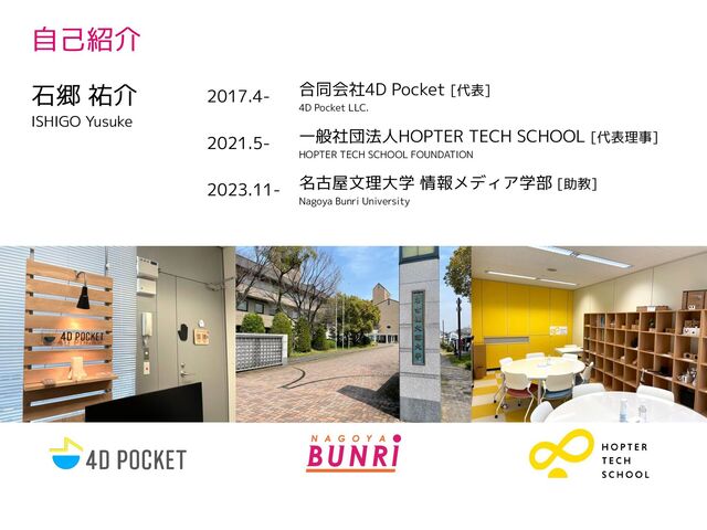 [代表理事] HOPTER TECH SCHOOL FOUNDATION 2021.5- 石郷 祐介 ISHIGO Yusuke 名古屋文理大学 情報メディア学部 [助教] Nagoya Bunri University 2023.11- 自己紹介