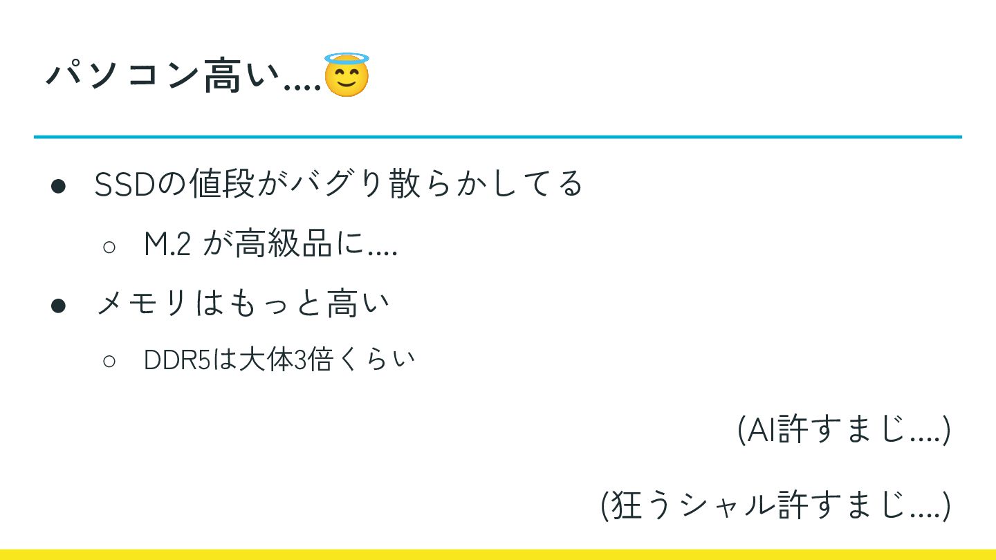 パソコン高い....😇 • SSDの値段がバグり散らかしてる ◦ M.2 が高級品に.... • メモリはもっと高い ◦ DDR5は大体3倍くらい