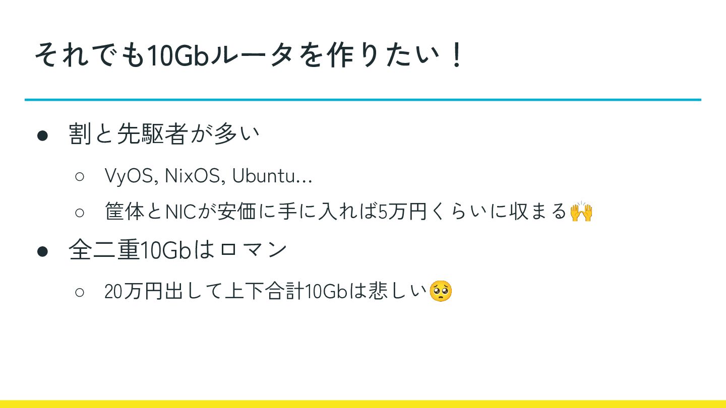 それでも10Gbルータを作りたい! • 割と先駆者が多い ◦ VyOS, NixOS, Ubuntu… ◦ 筐体とNICが安価に手に入れば5万円くらいに収まる🙌 •