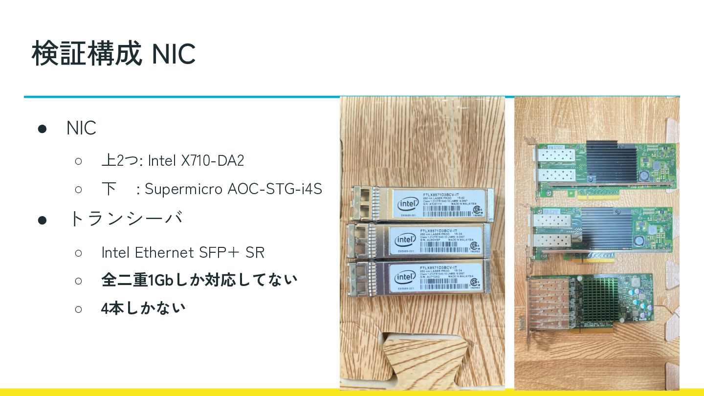 AOC-STG-i4S • トランシーバ ◦ Intel Ethernet SFP+ SR ◦ 全二重1Gbしか対応してない ◦ 4本しかない 検証構成 NIC