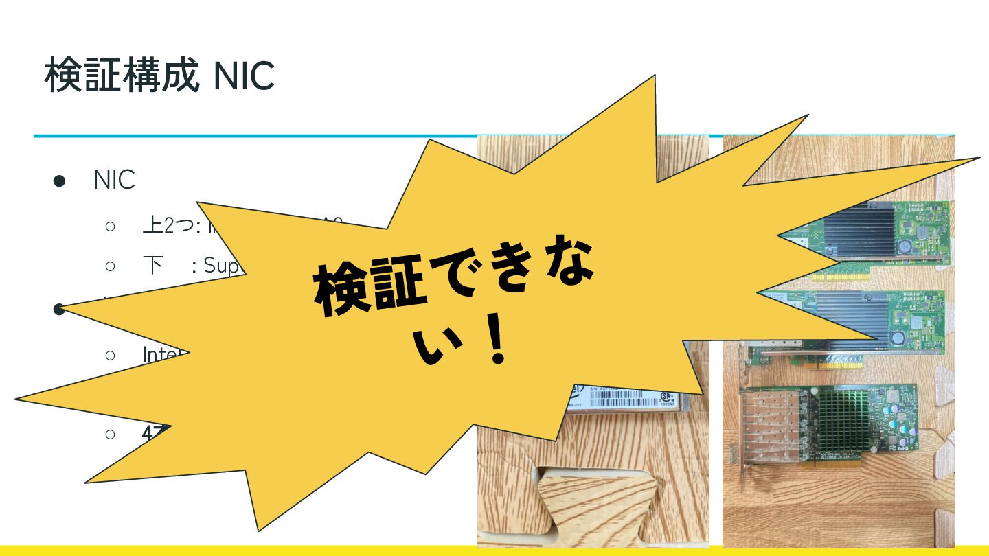 AOC-STG-i4S • トランシーバ ◦ Intel Ethernet SFP+ SR ◦ 全二重1Gbしか対応してない ◦ 4本しかない 検証構成 NIC 検証できな い!