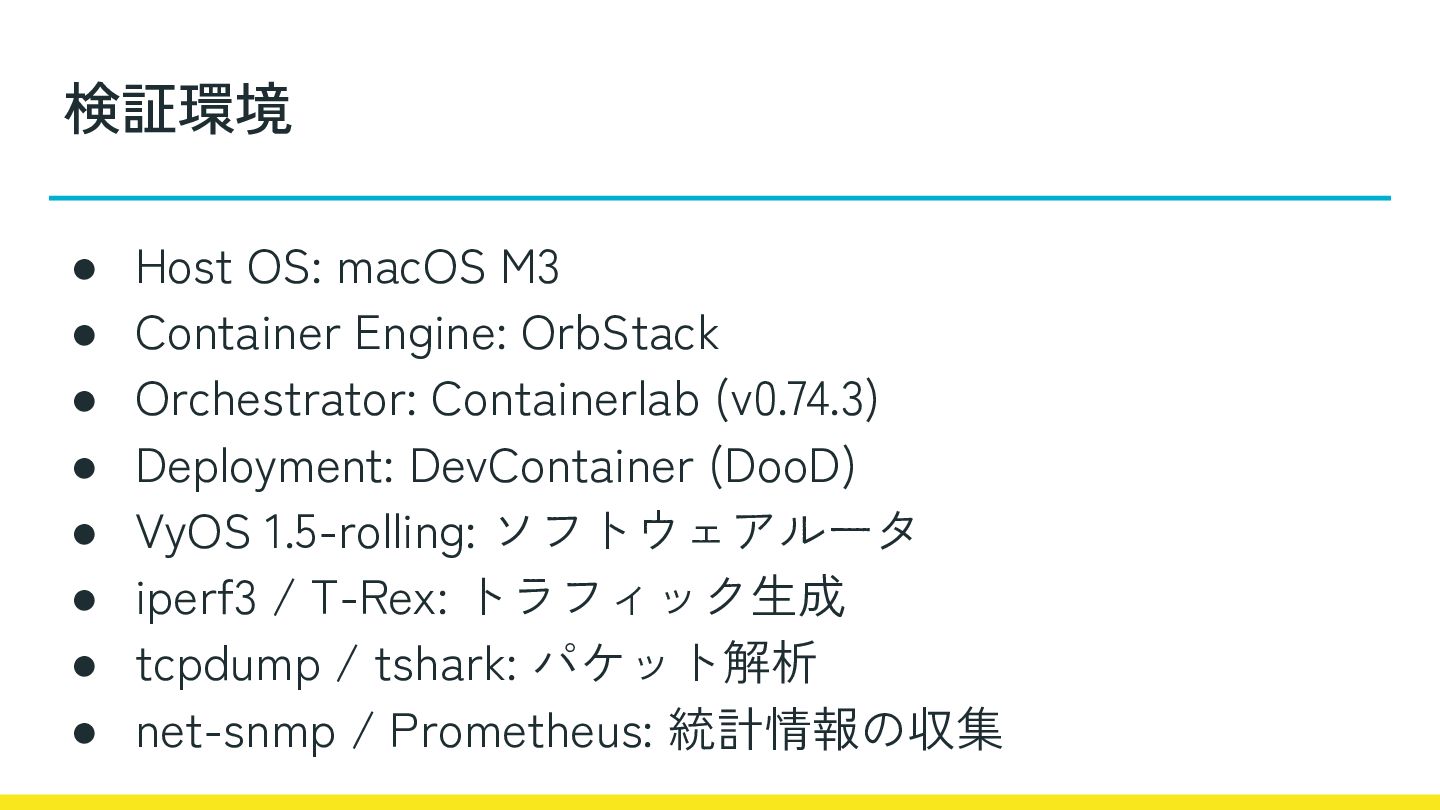 • Orchestrator: Containerlab (v0.74.3) • Deployment: DevContainer (DooD) • VyOS 1.5-rolling: ソフトウェアルータ • iperf3 / T-Rex: トラフィック生成 • tcpdump / tshark: パケット解析 • net-snmp / Prometheus: 統計情報の収集