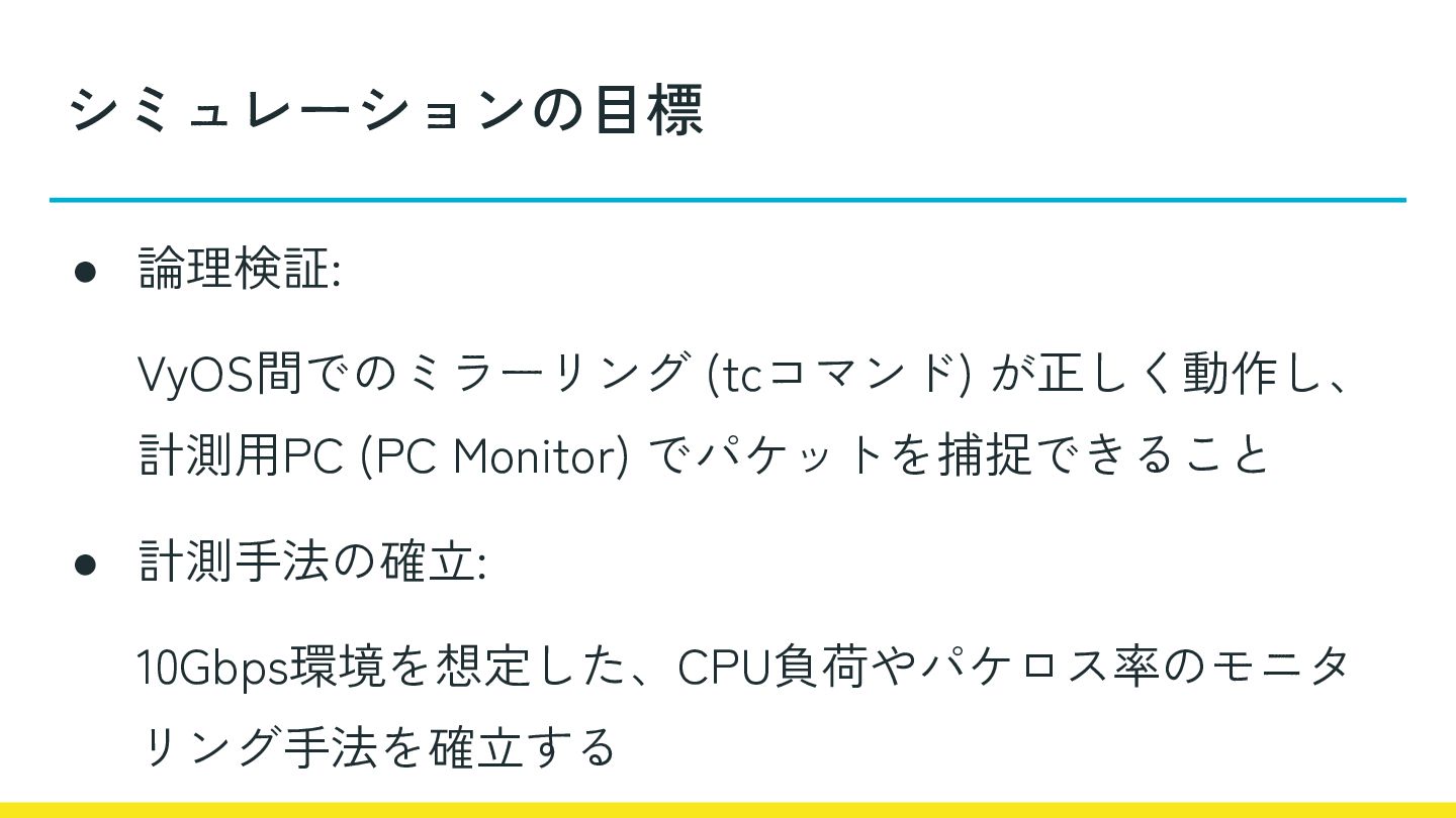 シミュレーションの目標 • 論理検証: VyOS間でのミラーリング (tcコマンド) が正しく動作し、 計測用PC (PC Monitor) でパケットを捕捉できること