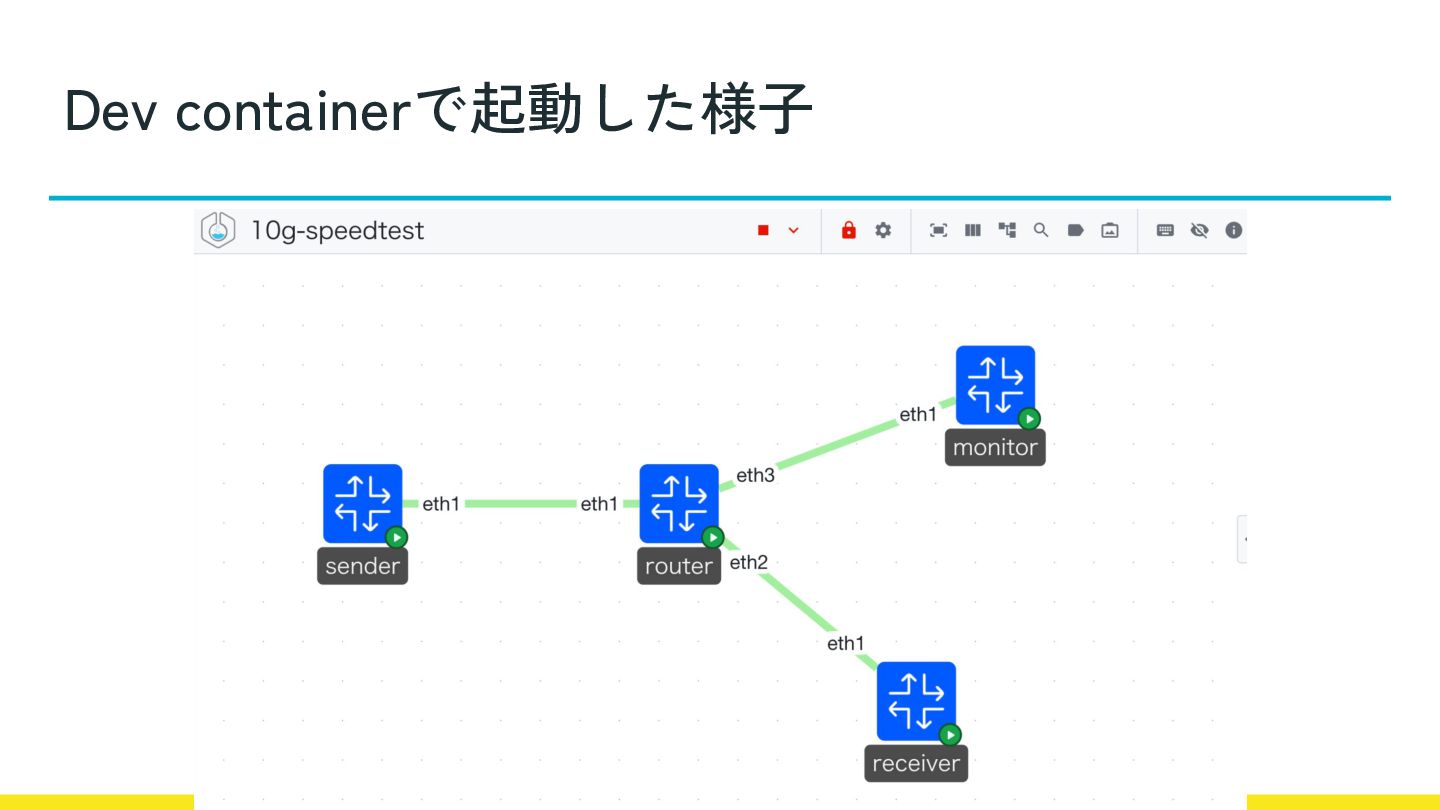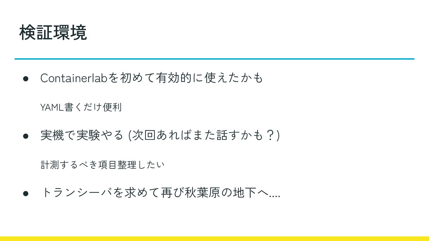 検証環境 • Containerlabを初めて有効的に使えたかも YAML書くだけ便利 • 実機で実験やる (次回あればまた話すかも?) 計測するべき項目整理したい • トランシーバを求めて再び秋葉原の地下へ....