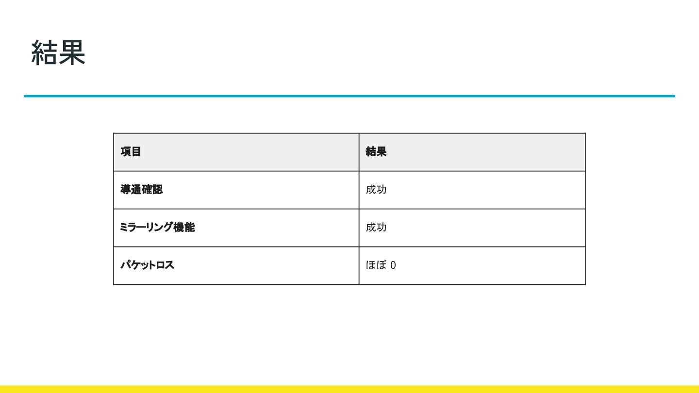 結果 項目 結果 導通確認 成功 ミラーリング機能 成功 パケットロス ほぼ 0