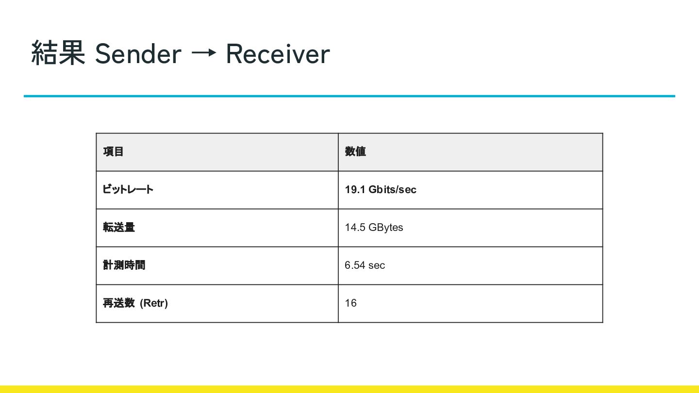 結果 Sender → Receiver 項目 数値 ビットレート 19.1 Gbits/sec 転送量