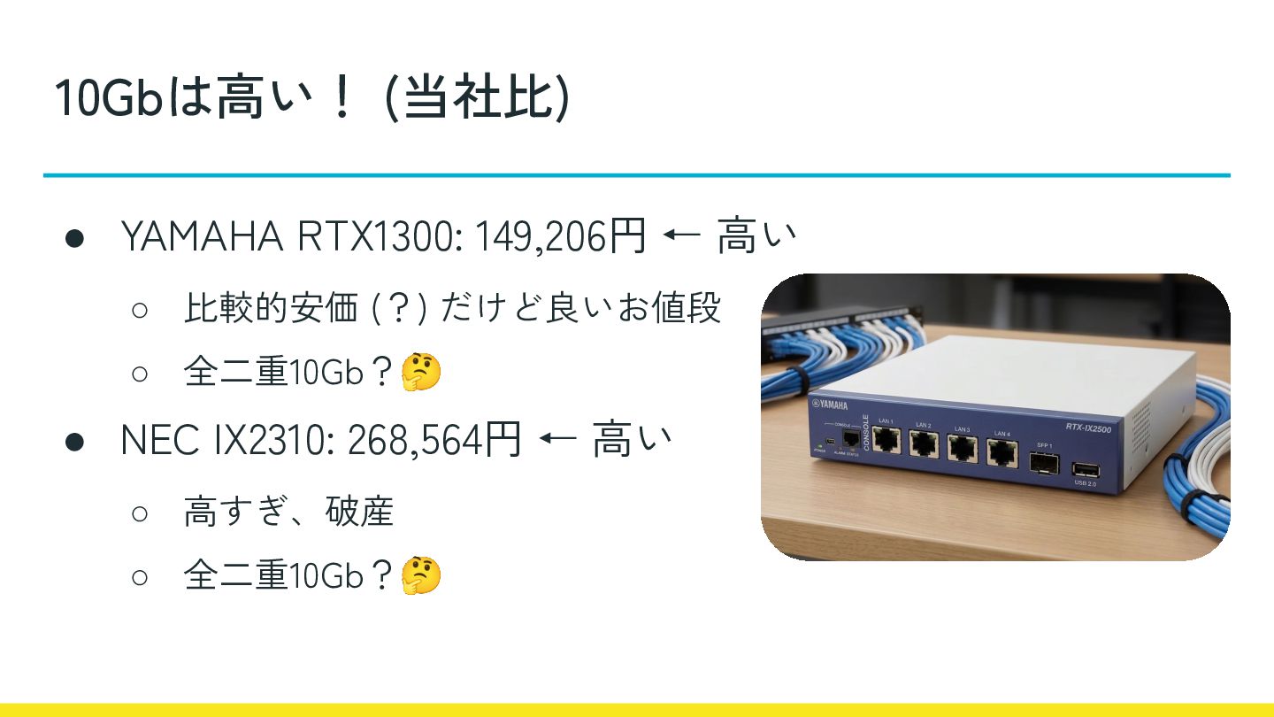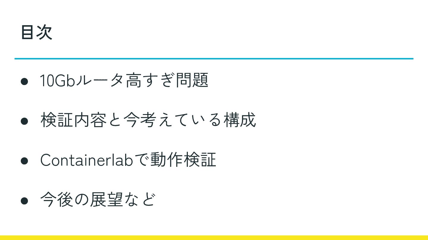 • 10Gbルータ高すぎ問題 • 検証内容と今考えている構成 • Containerlabで動作検証 • 今後の展望など 目次
