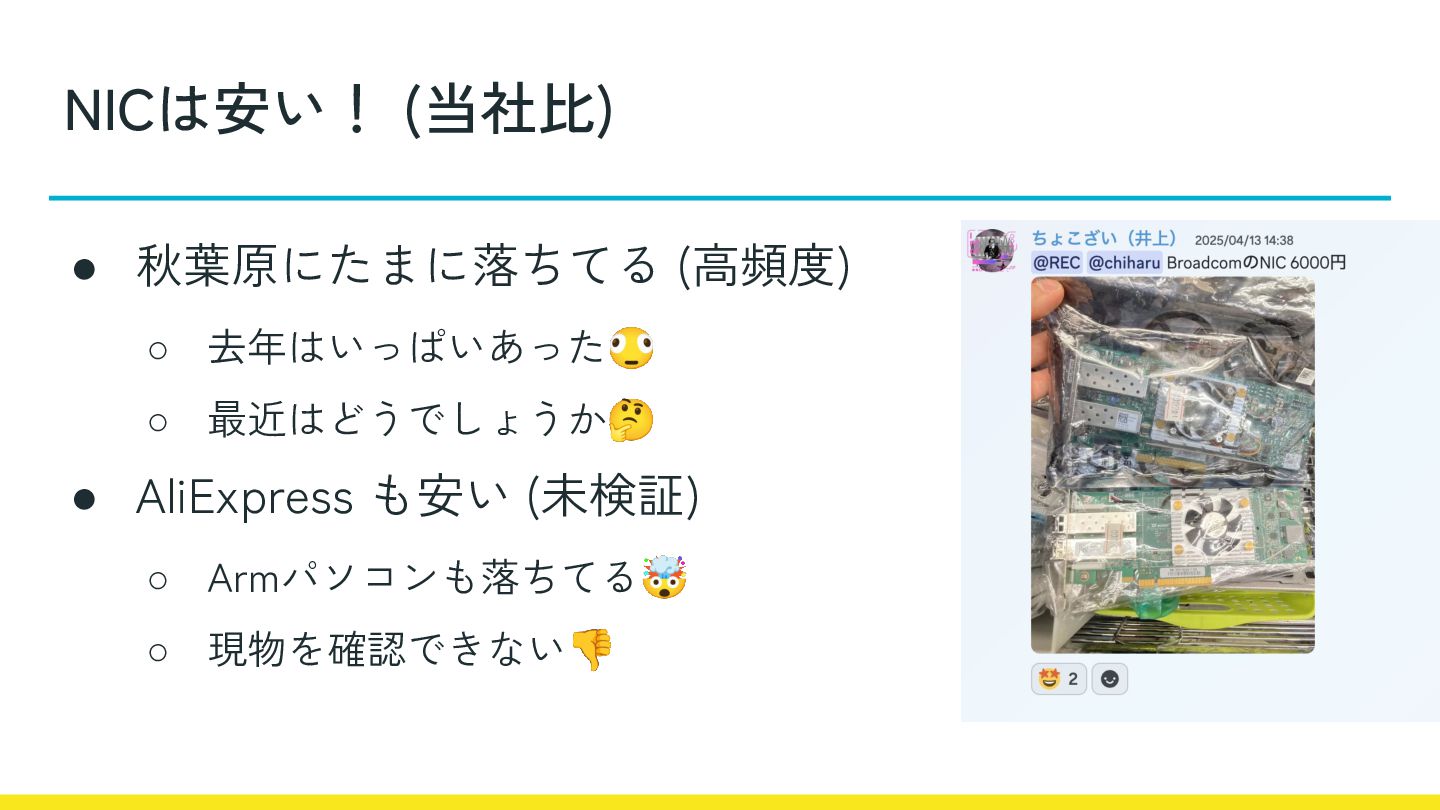 NICは安い! (当社比) • 秋葉原にたまに落ちてる (高頻度) ◦ 去年はいっぱいあった ◦ 最近はどうでしょうか🤔 •