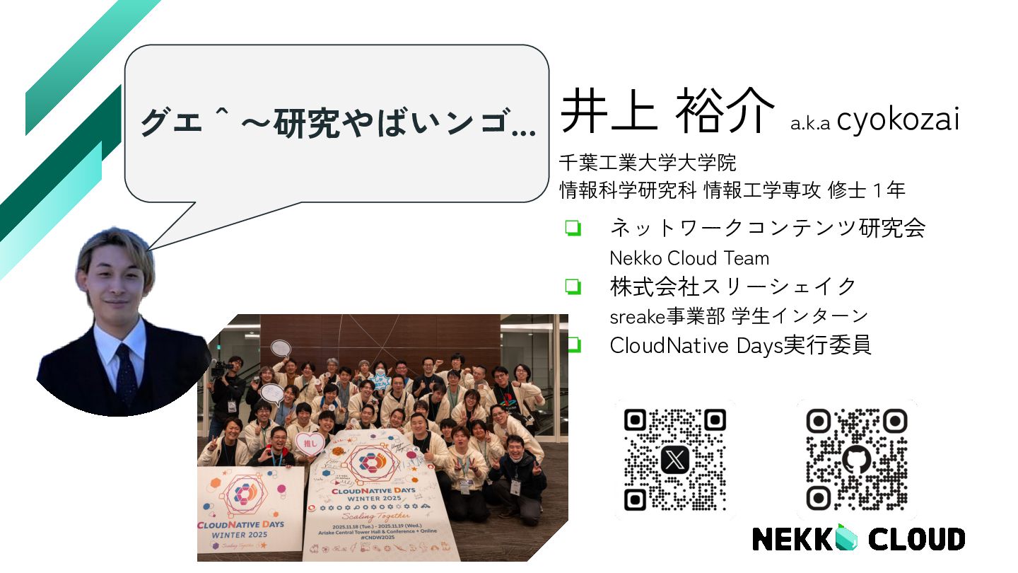 Nekko Cloud Team ❏ 株式会社スリーシェイク sreake事業部 学生インターン ❏ CloudNative Days実行委員 グエ^〜研究やばいンゴ...