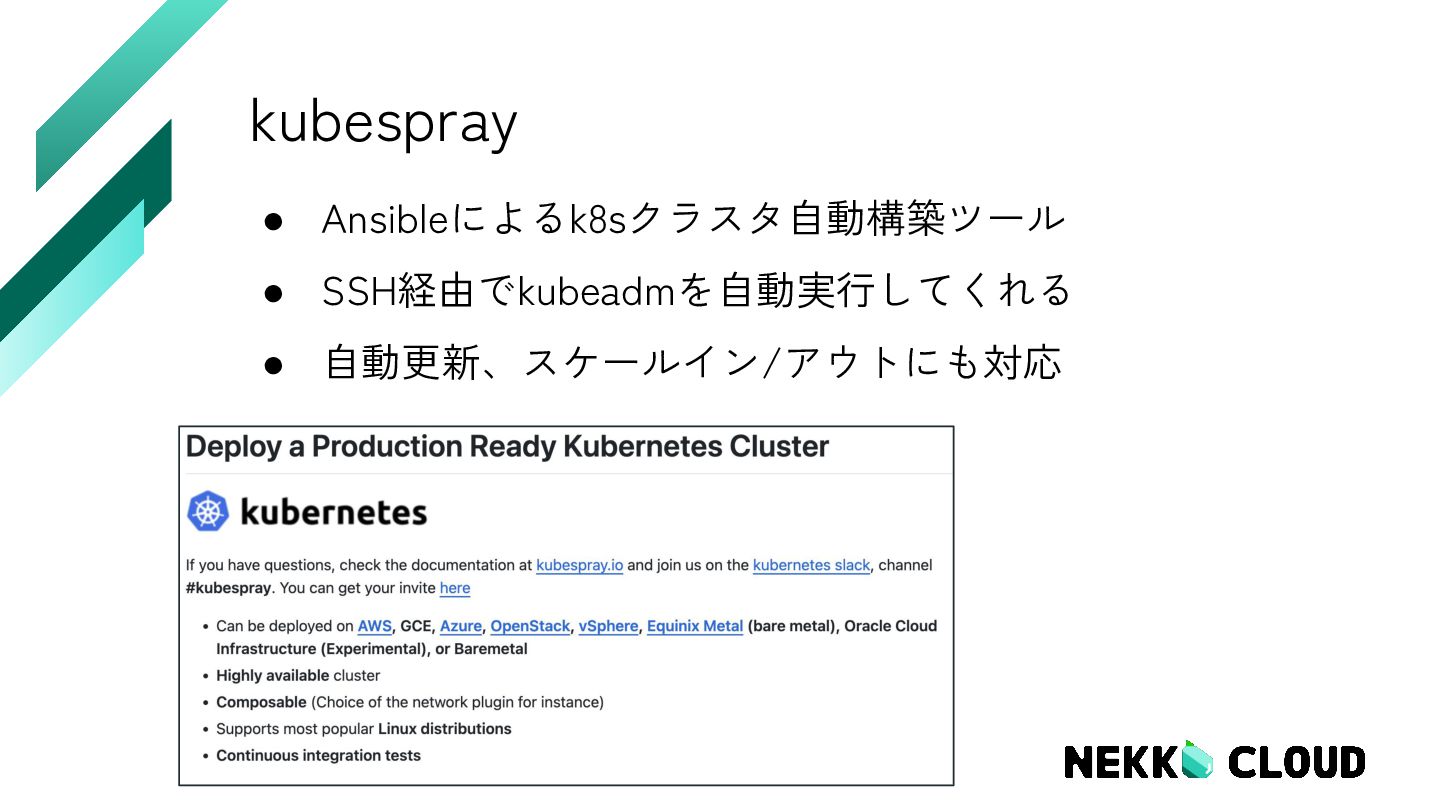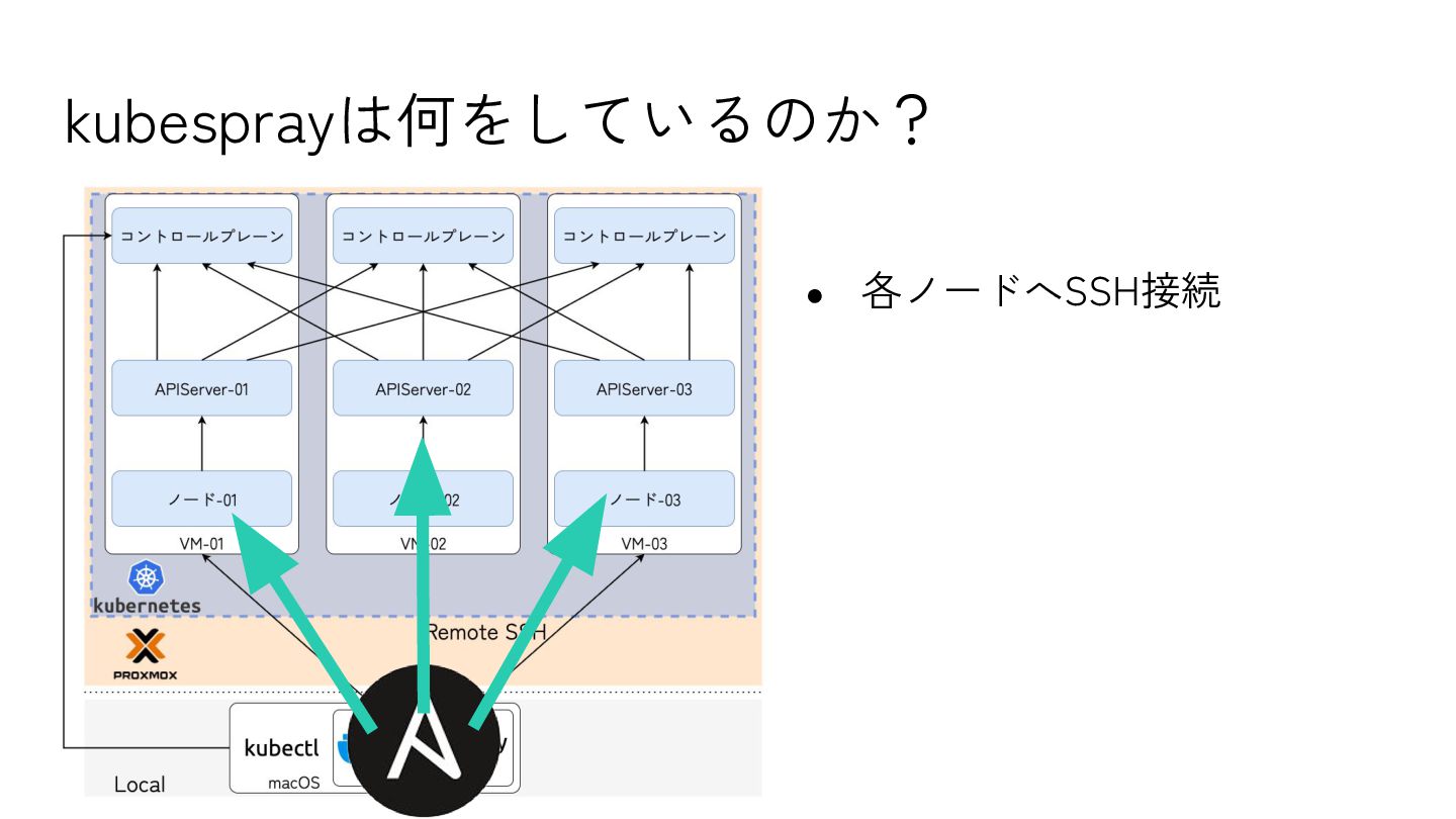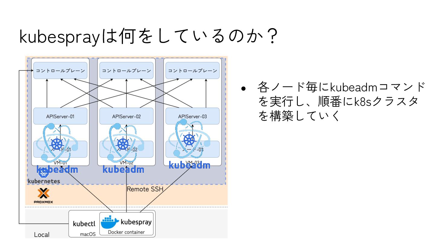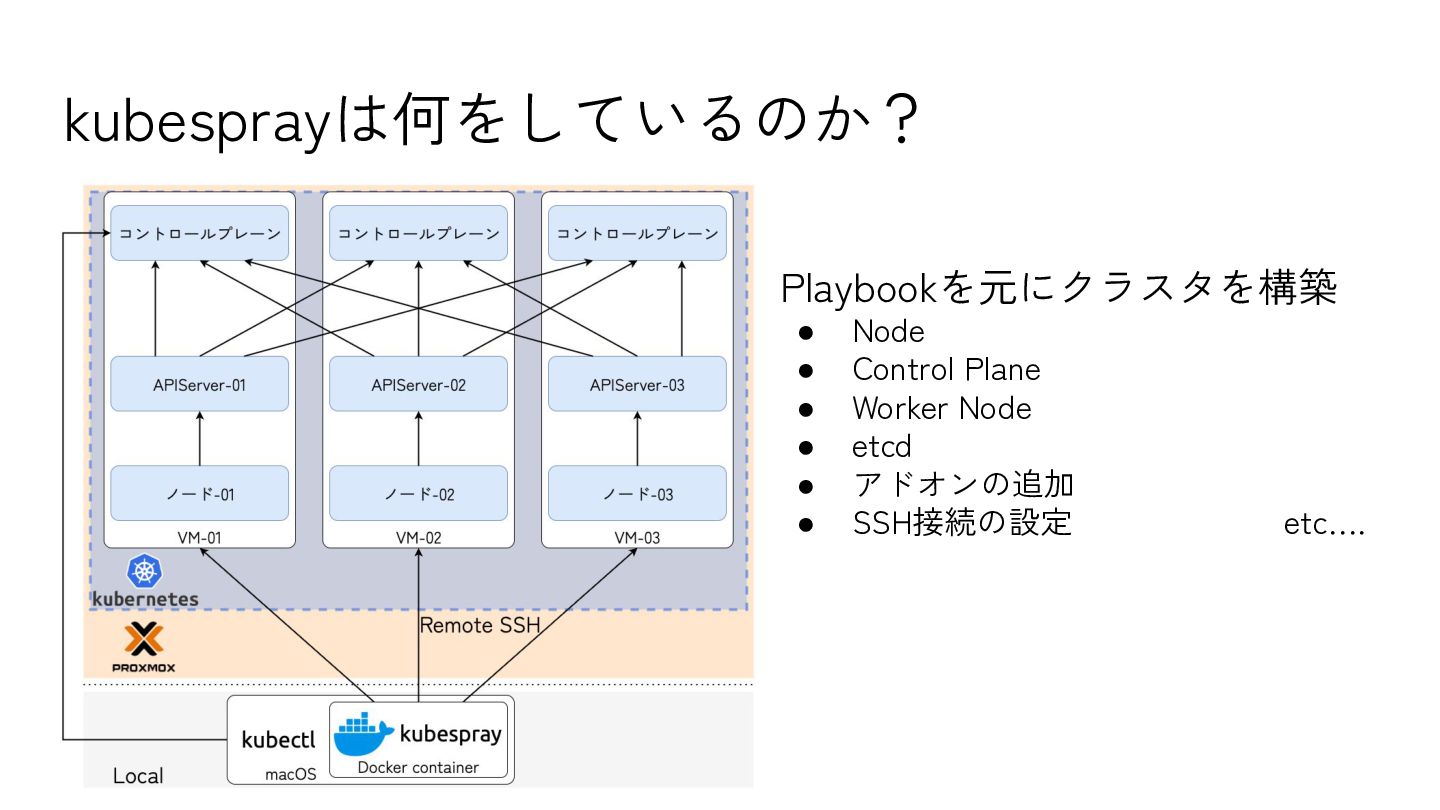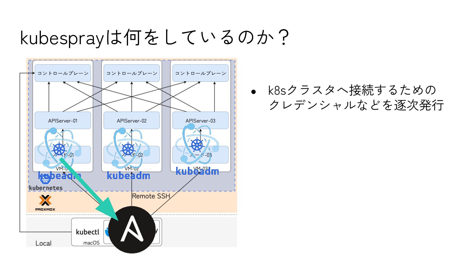 5. k8sバージョンに対応するkubesprayリポジトリをクローン 6. pip install → Ansibleなどインストール 7. Ansible Playbookを実行 8. 発行されたadmin.confをKUBECONFIGに設定
