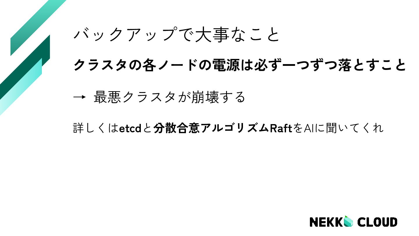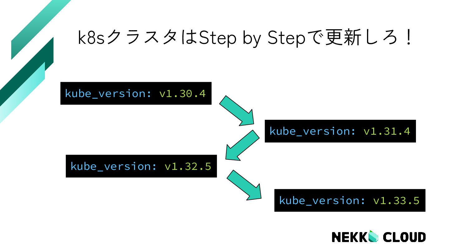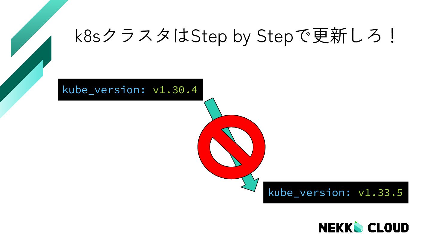 vm-01 Ready control-plane 386d v1.30.4 vm-02 Ready control-plane 386d v1.30.4 vm-03 Ready control-plane 386d v1.30.4 変更前の状態 2025.12.05時点 全部コントロールプレーン!? 1年稼働中 EOL….