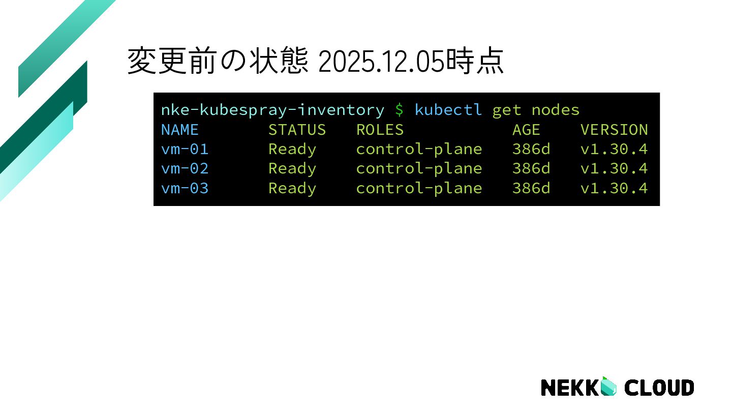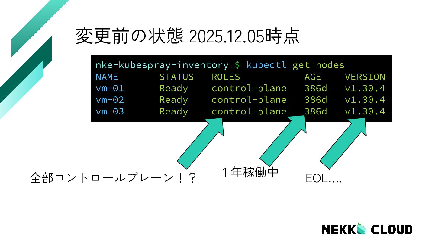 3. 変更前の状態 2025.12.05時点 nke-kubespray-inventory $ kubectl get nodes NAME STATUS ROLES