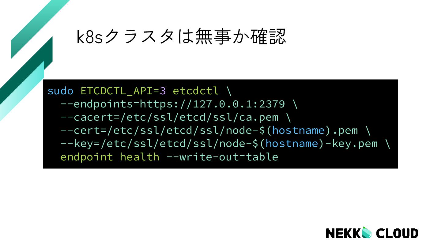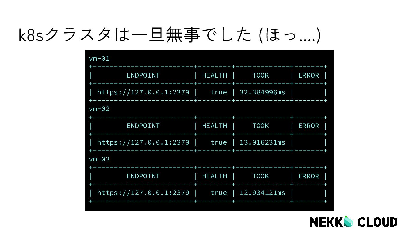5. k8sクラスタは一旦無事でした (ほっ....) vm-01 +------------------------+--------+-------------+-------+ | ENDPOINT | HEALTH | TOOK
