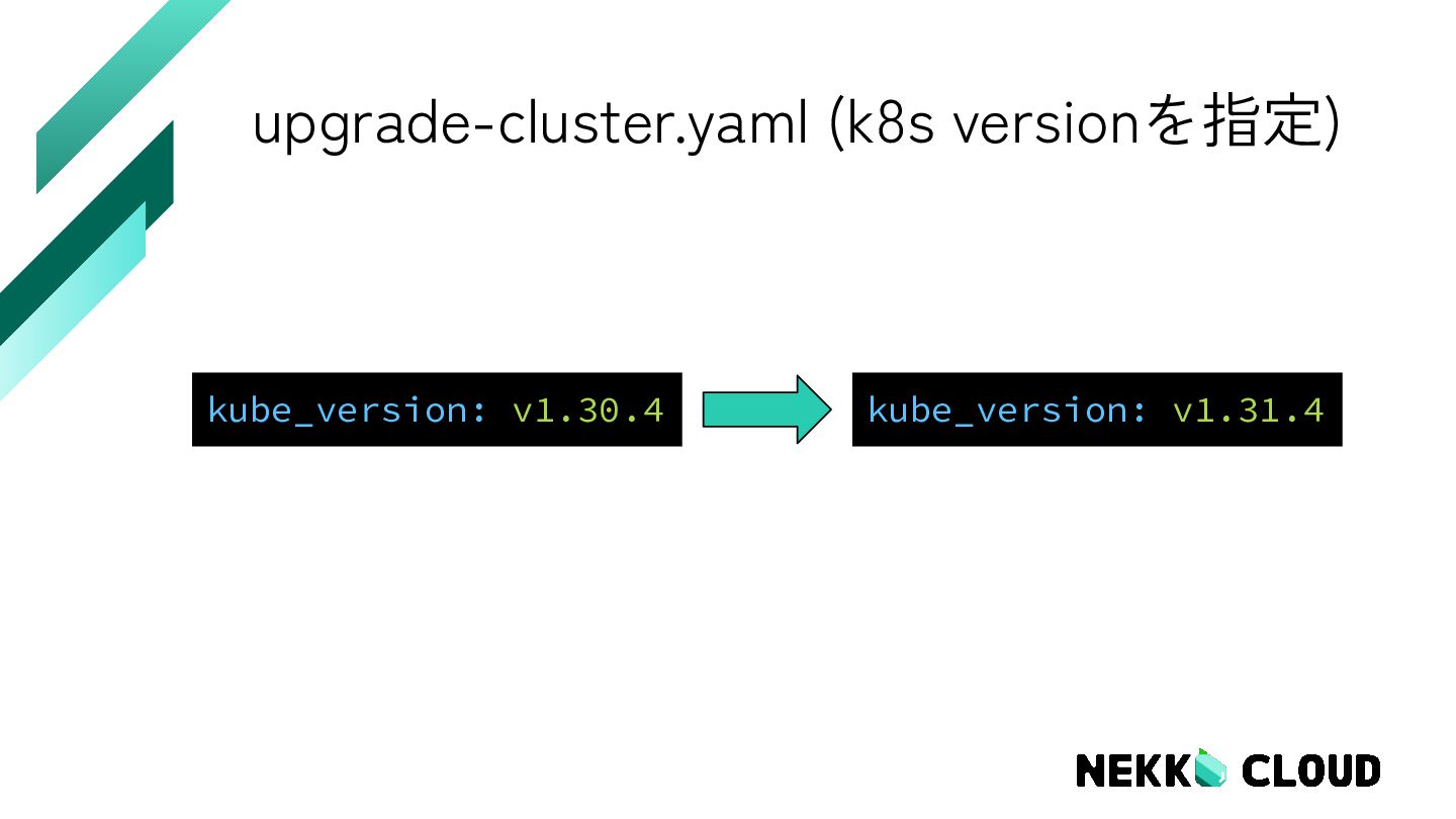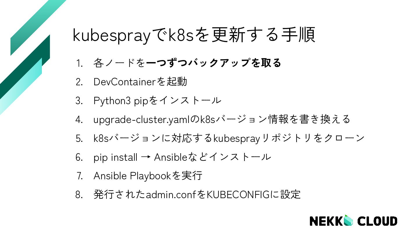 6. kubesprayでk8sを更新する手順 1. 各ノードを一つずつバックアップを取る 2. DevContainerを起動 3. Python3 pipをインストール 4. upgrade-cluster.yamlのk8sバージョン情報を書き換える