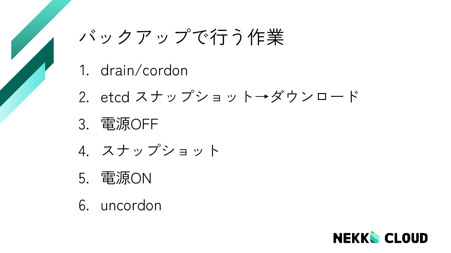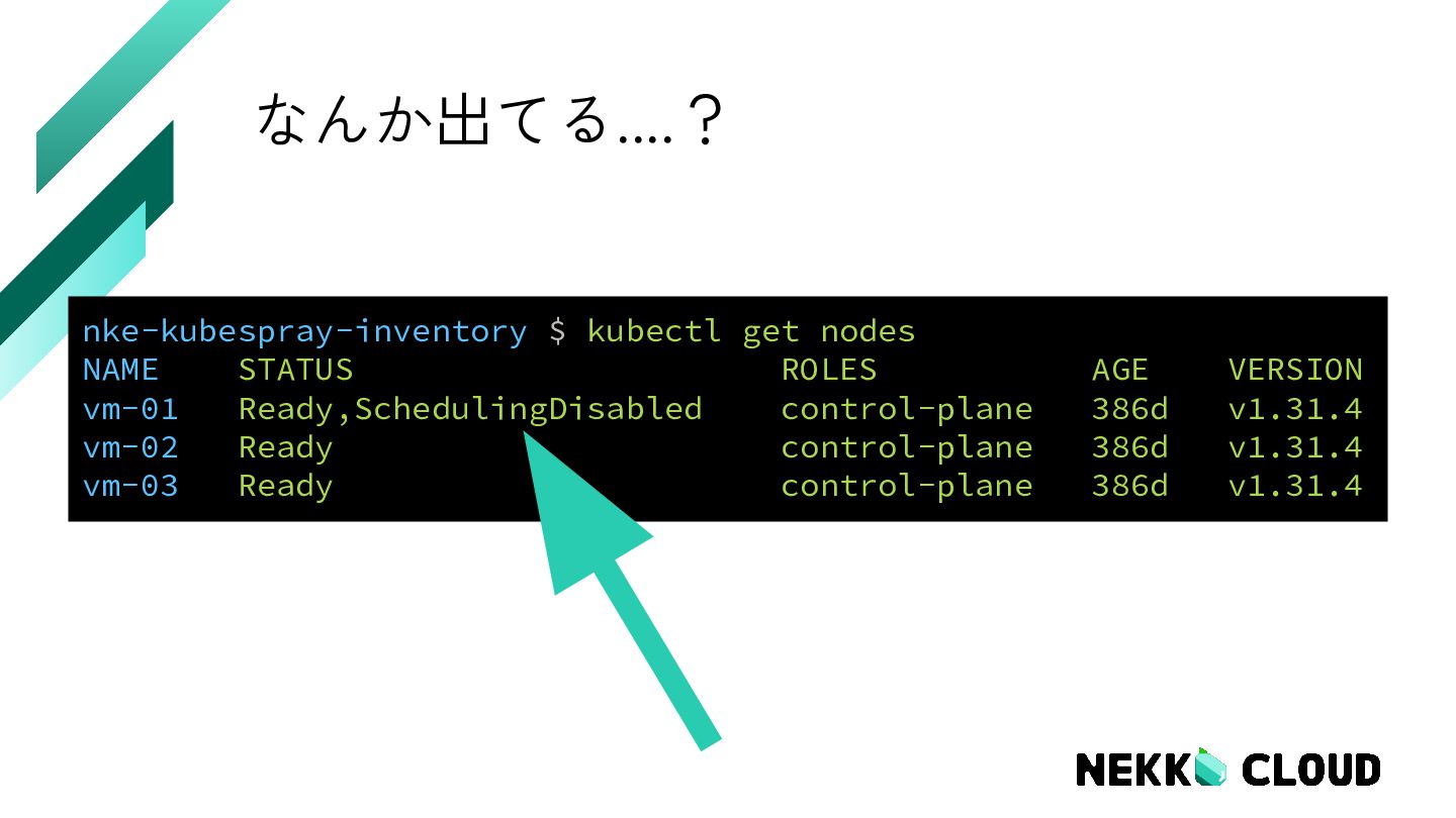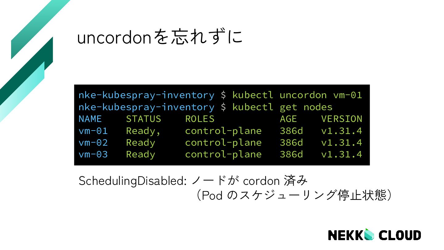 nodes NAME STATUS ROLES AGE VERSION vm-01 Ready, control-plane 386d v1.31.4 vm-02 Ready control-plane 386d v1.31.4 vm-03 Ready control-plane 386d v1.31.4 SchedulingDisabled: ノードが cordon 済み (Pod のスケジューリング停止状態)