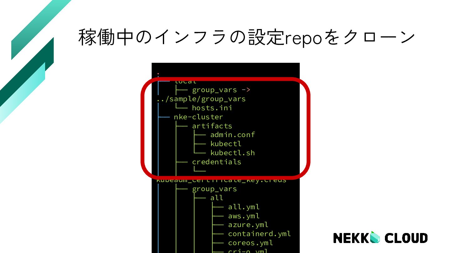 7. 稼働中のインフラの設定repoをクローン . ├── local │ ├── group_vars -> ../sample/group_vars │