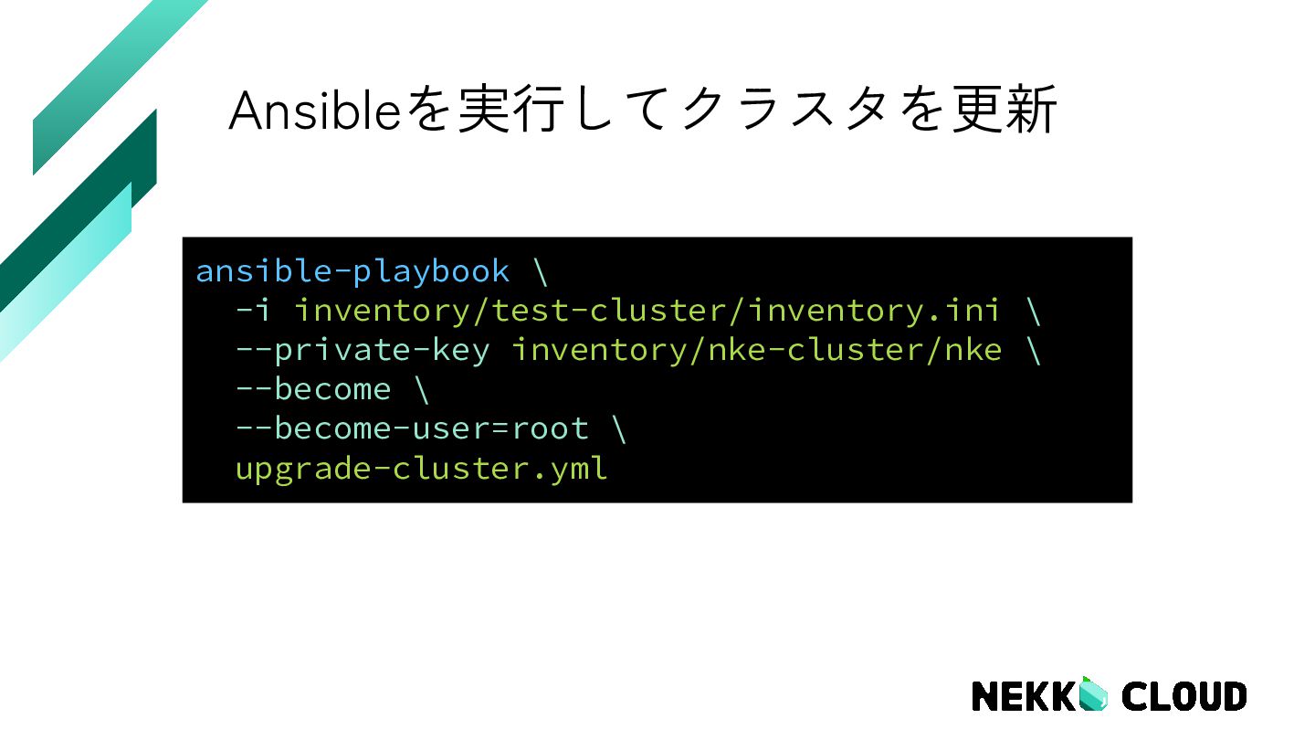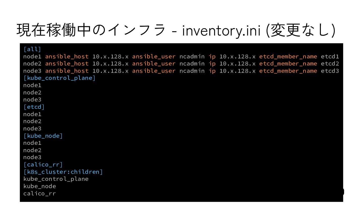 8. 現在稼働中のインフラ - inventory.ini (変更なし) [all] node1 ansible_host=10.x.128.x ansible_user=ncadmin ip=10.x.128.x etcd_member_name=etcd1