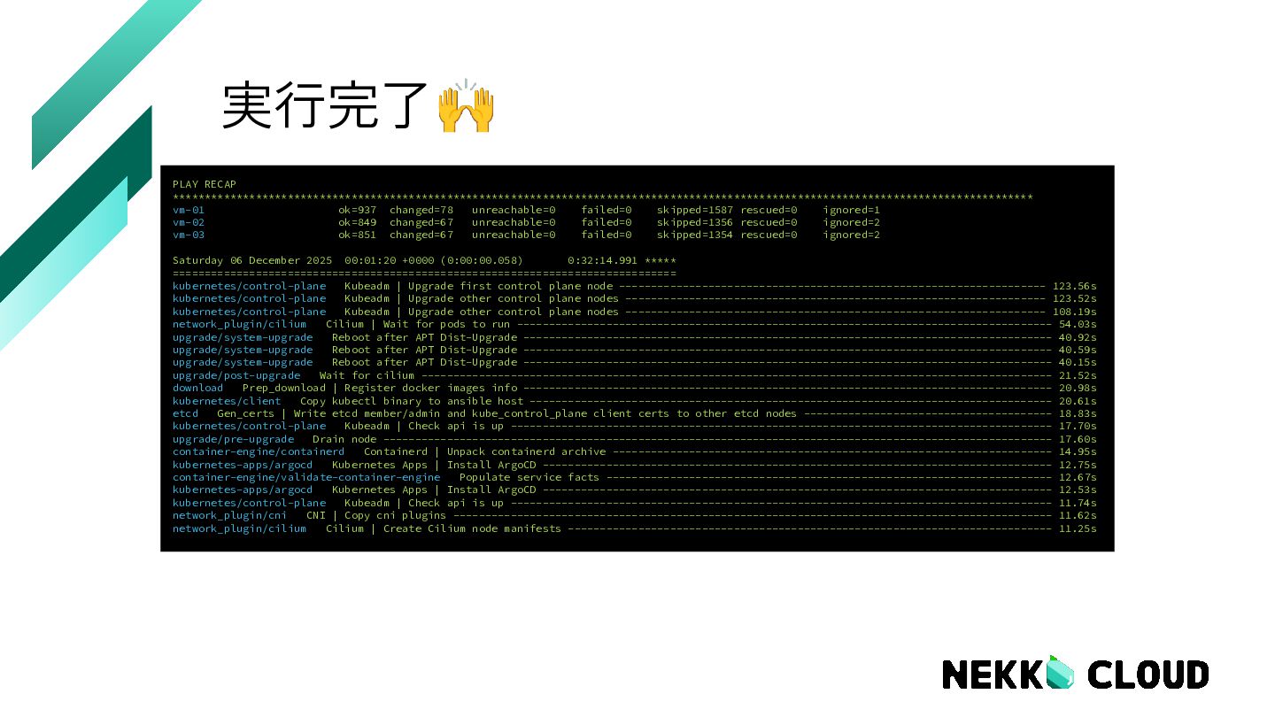 9. 実行完了🙌 PLAY RECAP *************************************************************************************************************************************** vm-01 : ok=937 changed=78 unreachable=0 failed=0