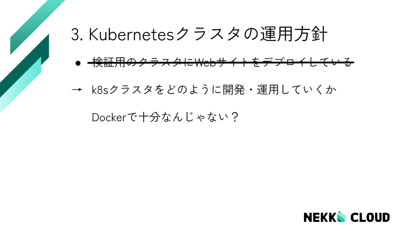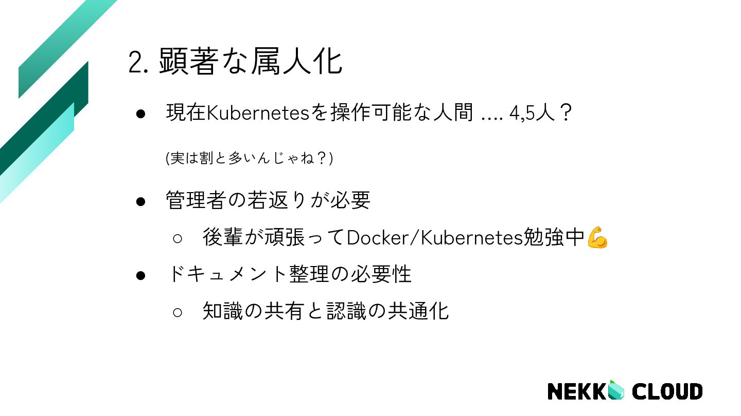 12. 2. 顕著な属人化 • 現在Kubernetesを操作可能な人間 …. 4,5人? (実は割と多いんじゃね?) • 管理者の若返りが必要 ◦