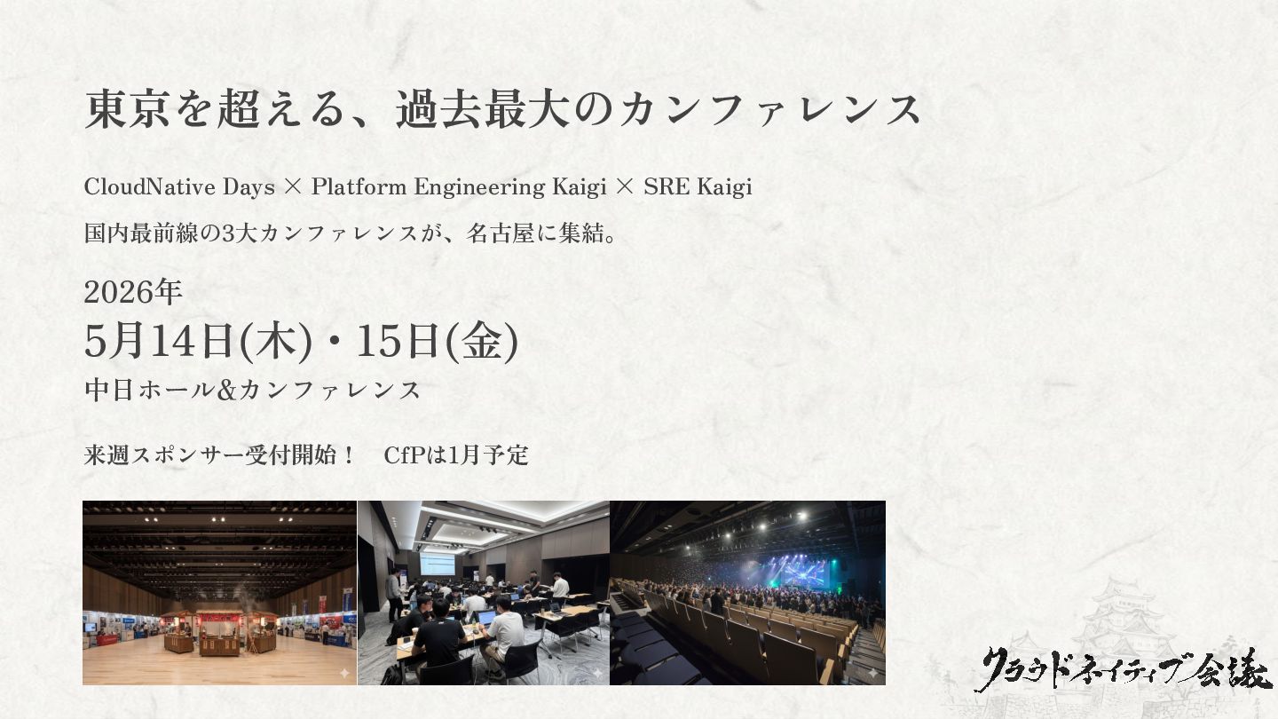 国内最前線の3大カンファレンスが、名古屋に集結。 2026年 5月14日(木)・15日(金) 中日ホール&カンファレンス 来週スポンサー受付開始! CfPは1月予定