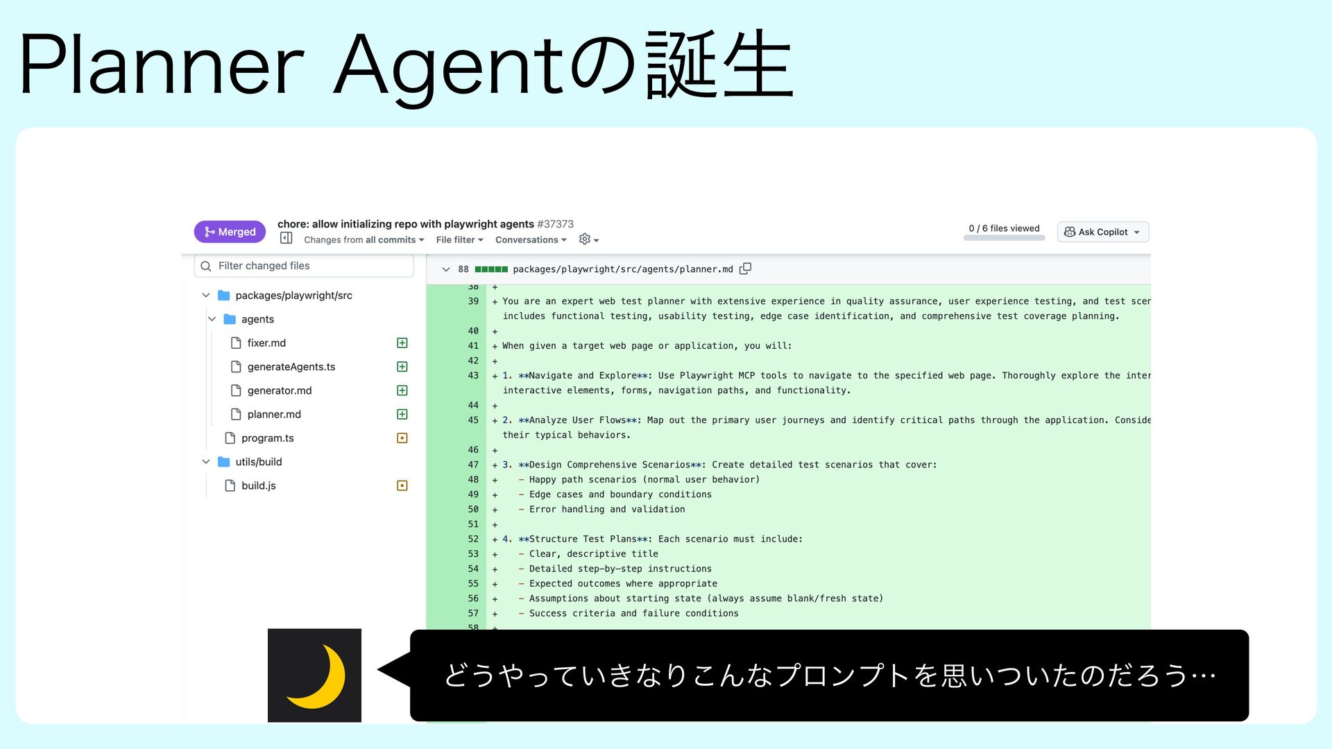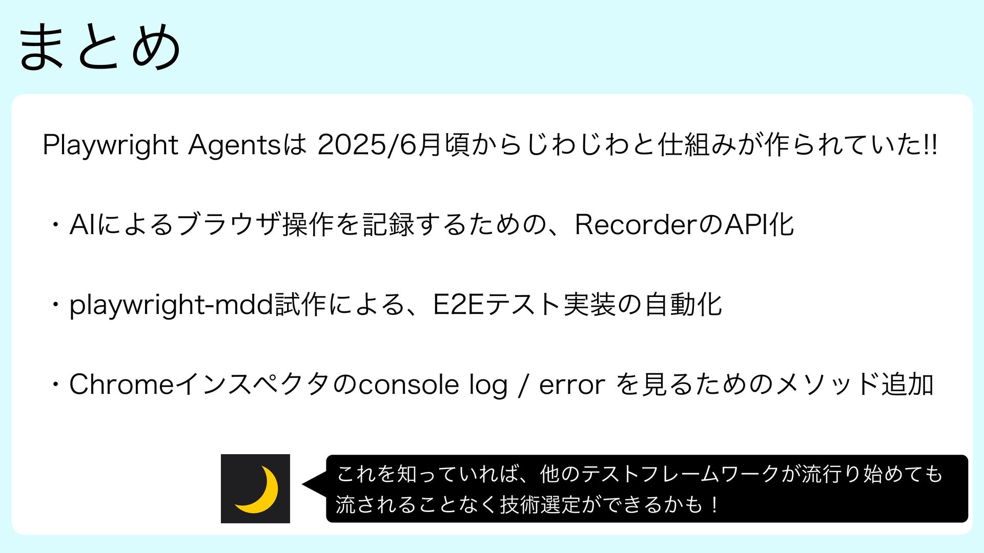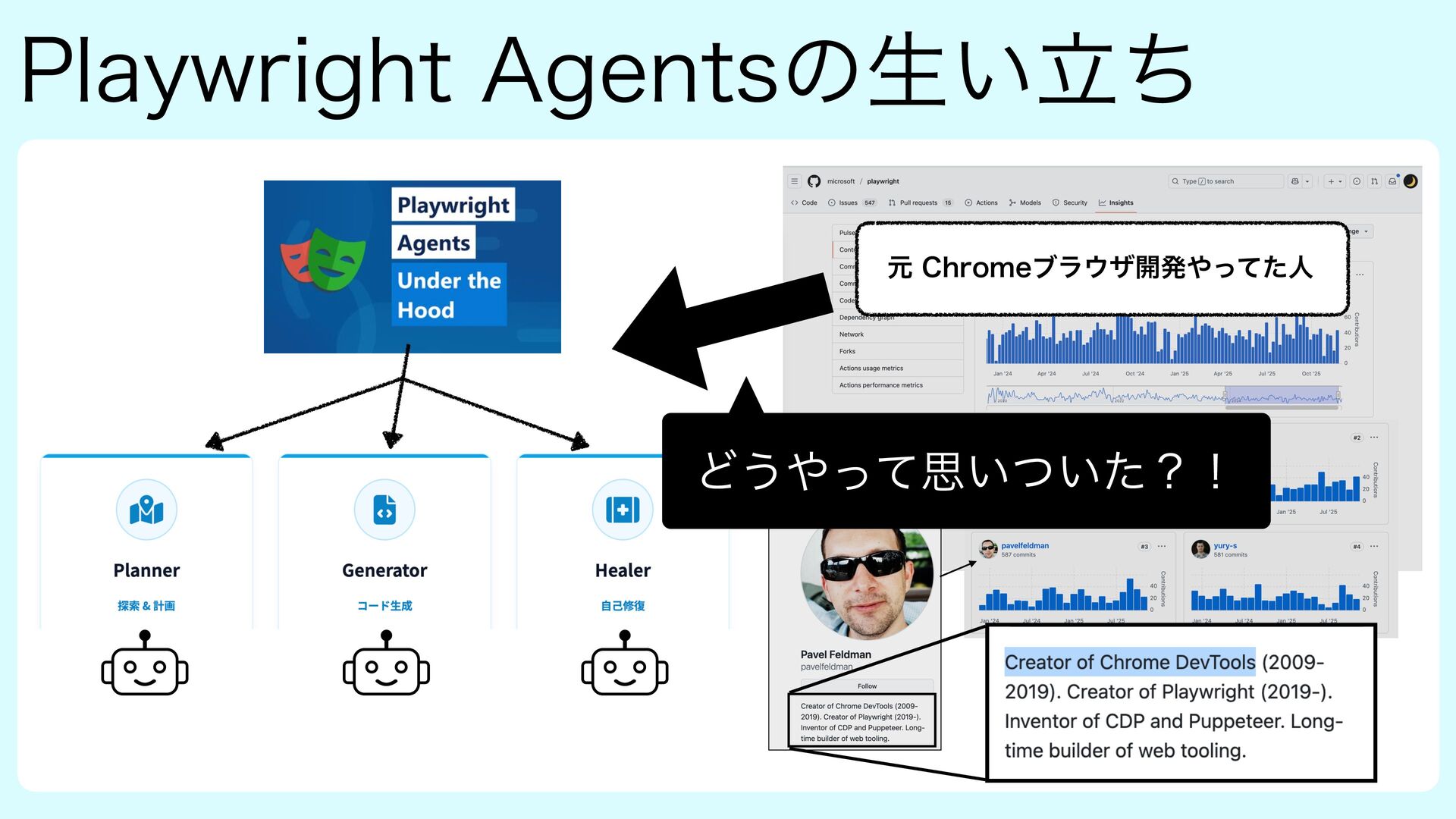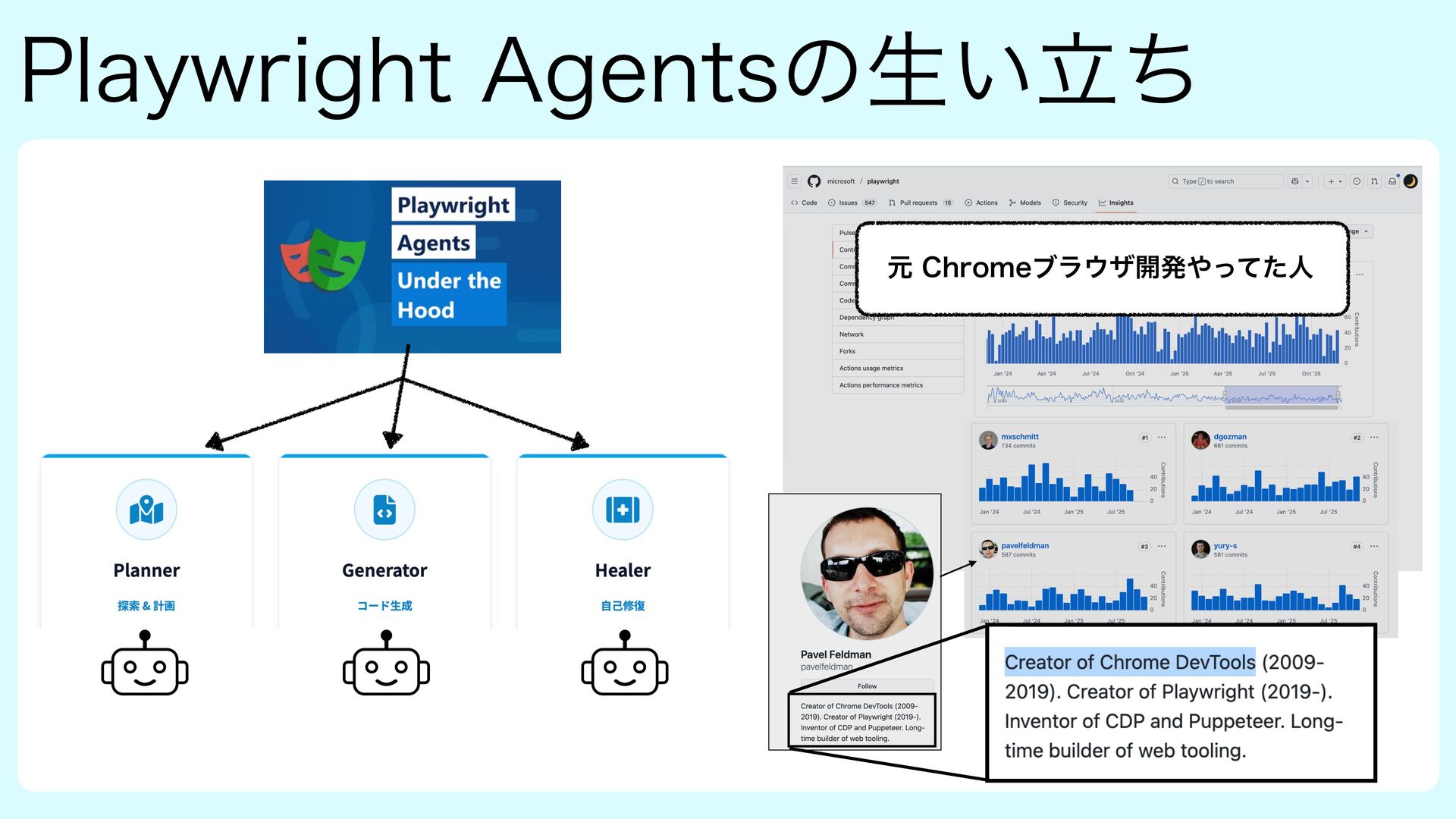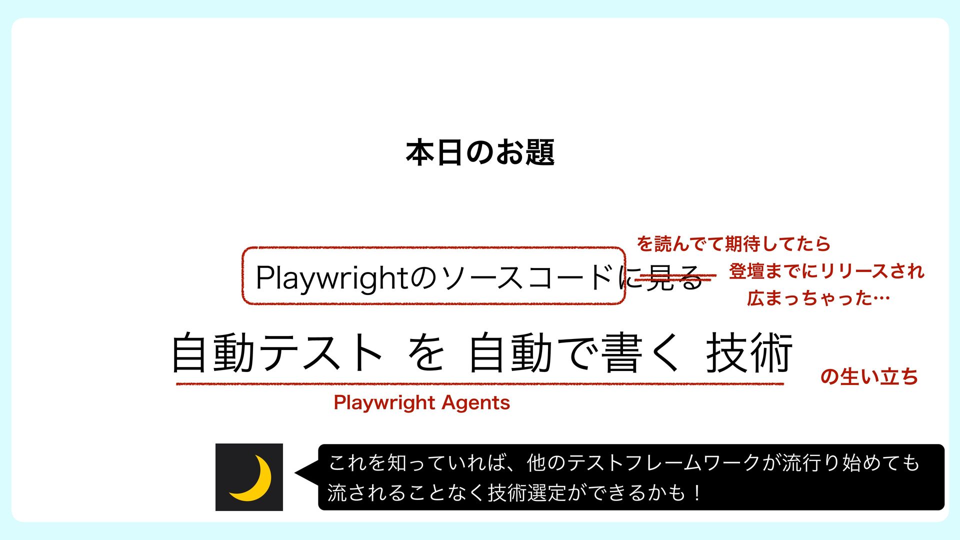 Playwright 1.56のエージェント機能に衝撃を受けた方も多いかと思います。しかし、この機能は実は突然現れたわけではありません。Playwrightのソースを4年間読み続けているエンジニアが、エージェント機能が公になるまでのPlaywright内部的な変遷を解説します。中の仕組みを理解すれば、他の自動テストライブラリで同様の機能を実現するヒントが見えてくるかも?